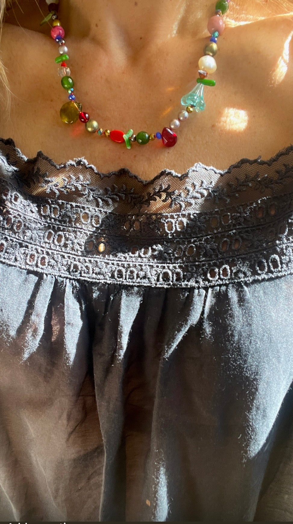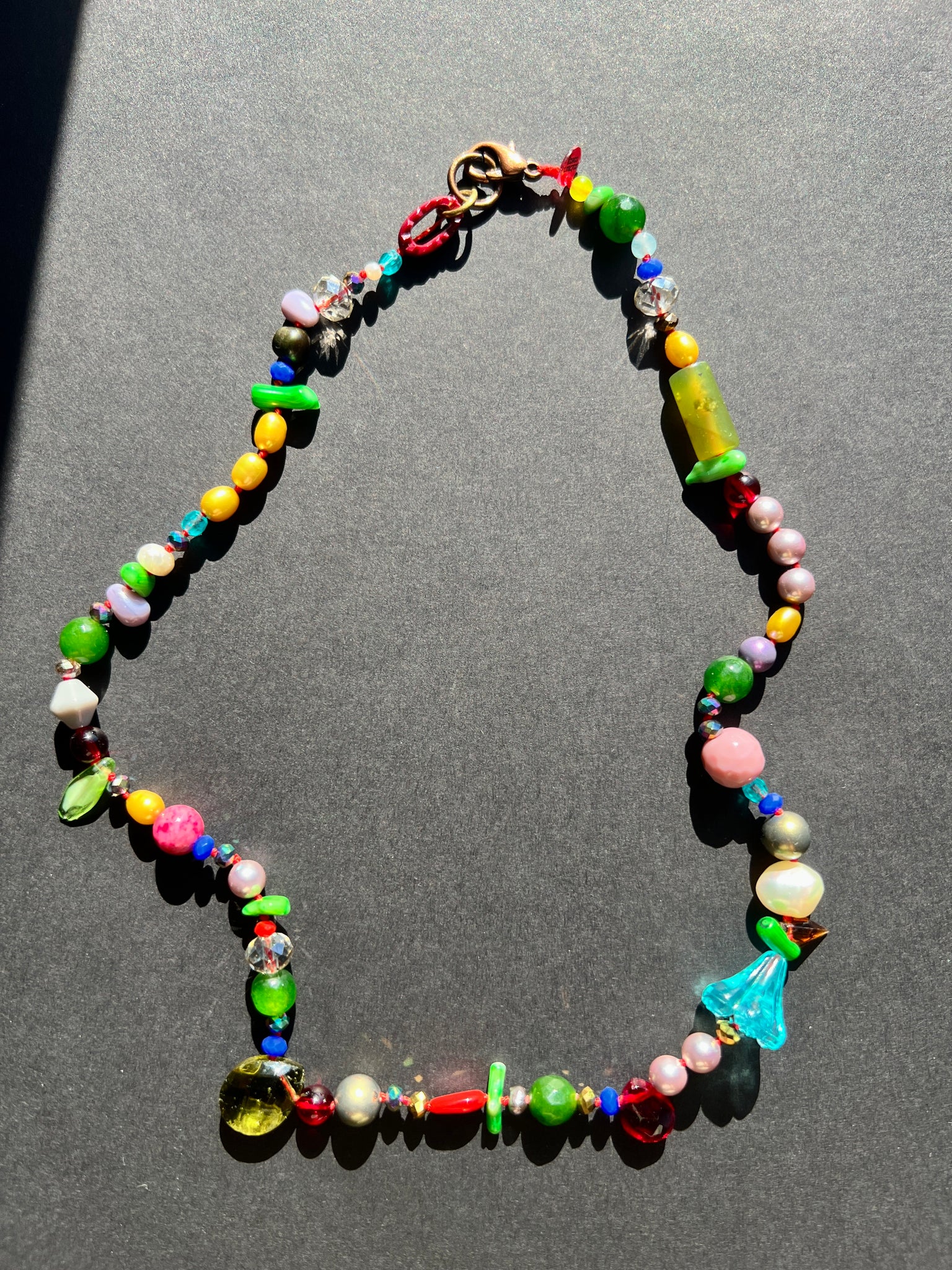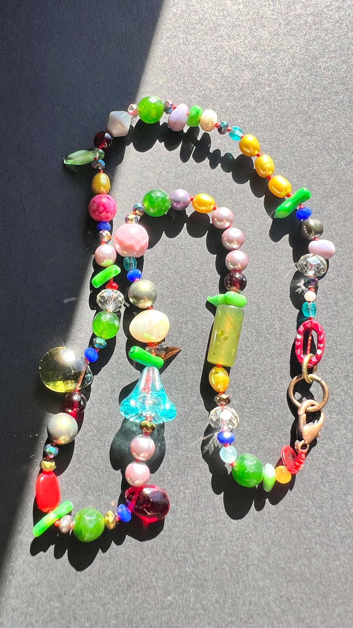 Fresh water pearls, vintage beads, agates and corals come together in one - of - a - kind mix of colours and textures.