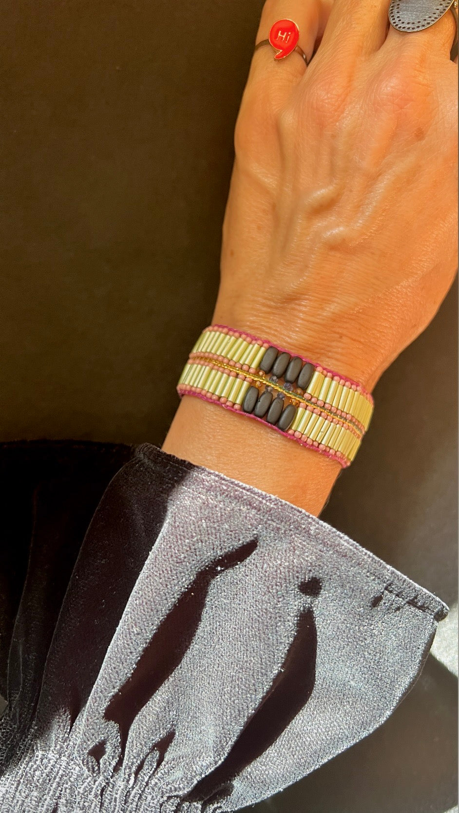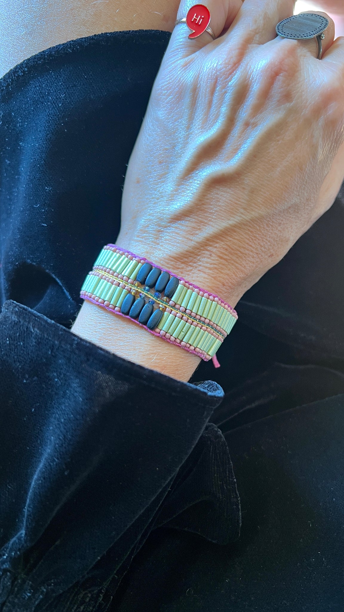 A unique, handmade bracelet crafted with elongated tubular glass beads in a metallic pistachio shade, accented with black details. A delicate row of blush pink powder beads runs alongside like a ribbon, adding a soft, refined contrast. Minimalist in design, this bracelet is fine, lightweight, and so comfortable it feels like a second skin on the wrist. A subtle statement piece for those who appreciate quiet elegance.