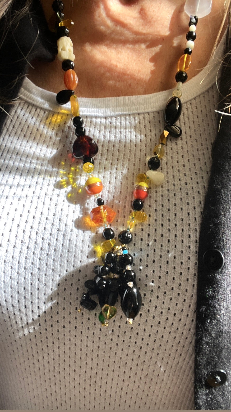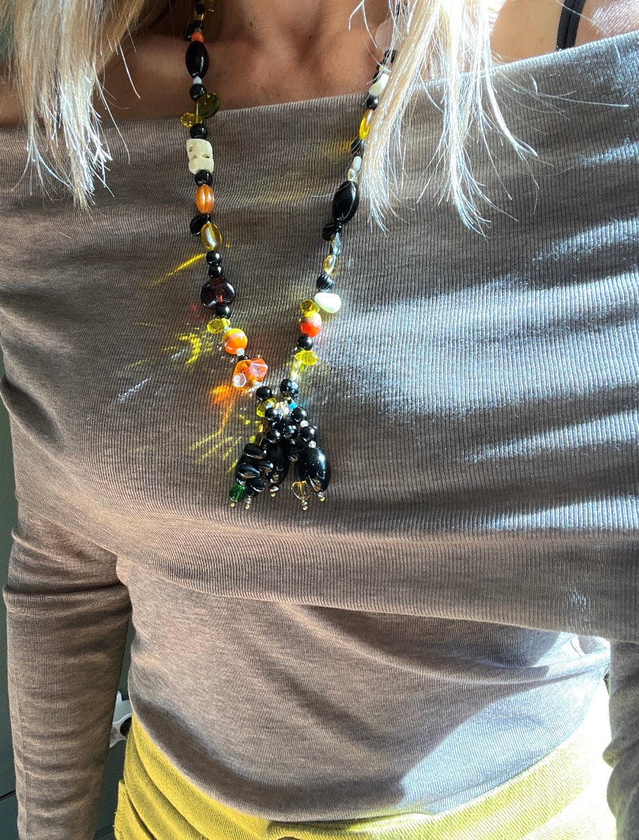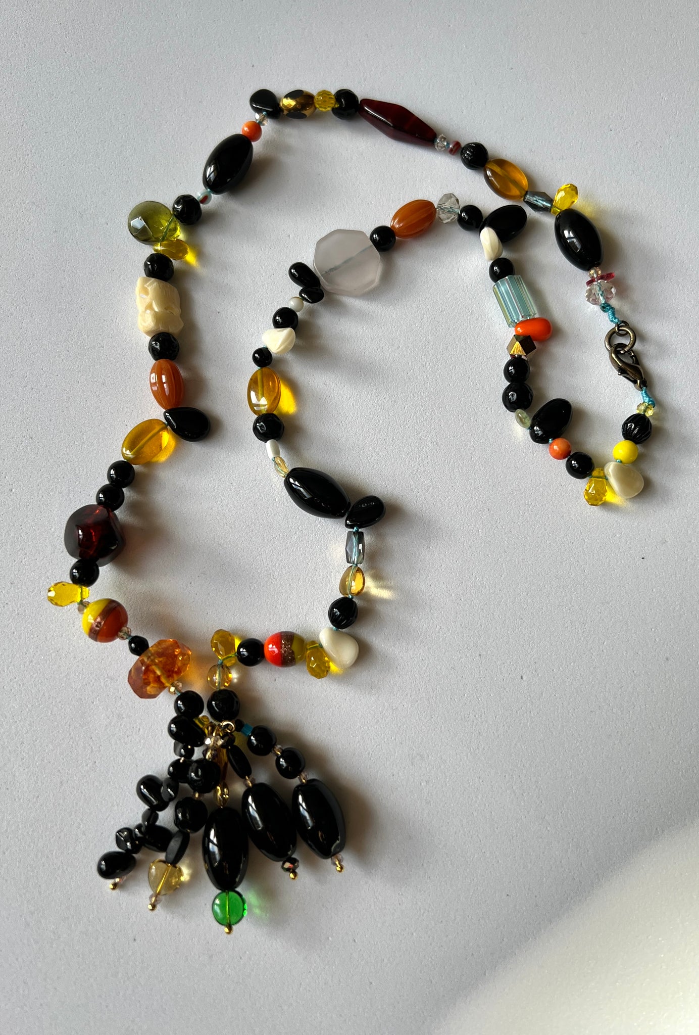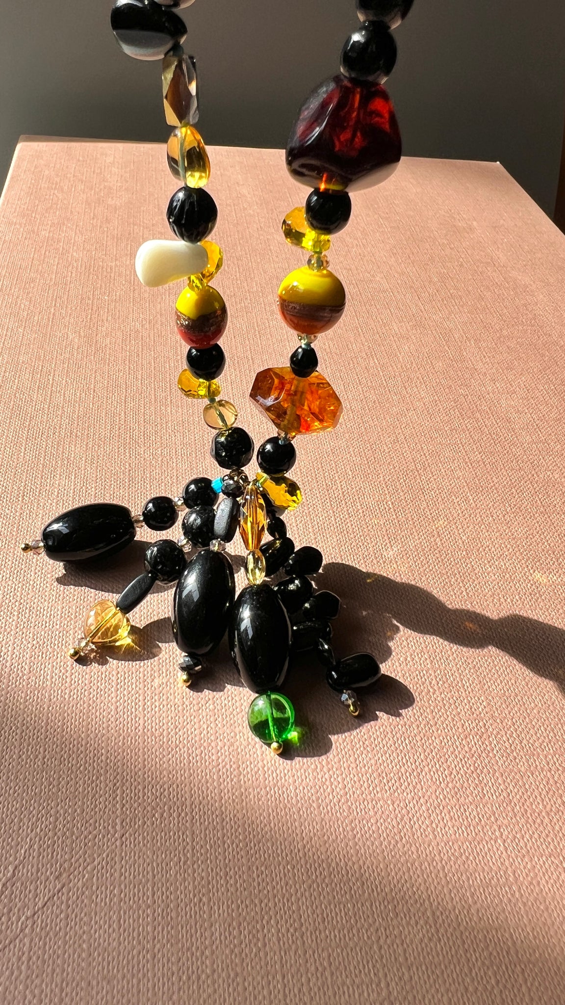 Handcrafted from curated mix of black, amber and orange vintage beads, each with its own timeless character. This one - of - a kind piece features a long, lean silhouette with a hand beaded tassel.