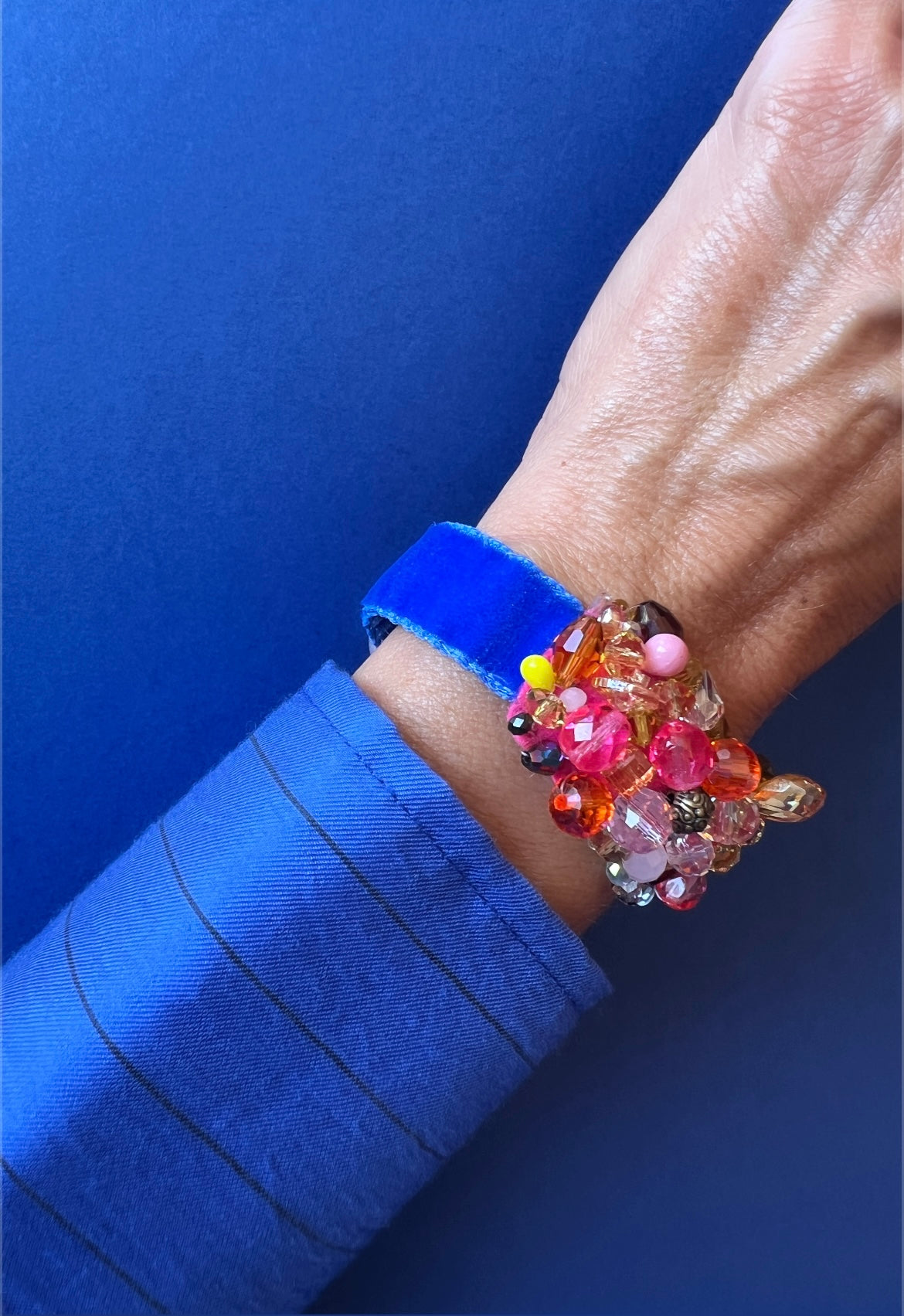 This bracelet is carefully made by hand from soft velvet ribbon, sewn double to forms its elegant base. Crystals and vintage beads are hand- sewn one by one, creating a subtle play of light and texture. The design is completed with a satin button as a closure. Crafted for those who value quality, authenticity and thoughtful design.