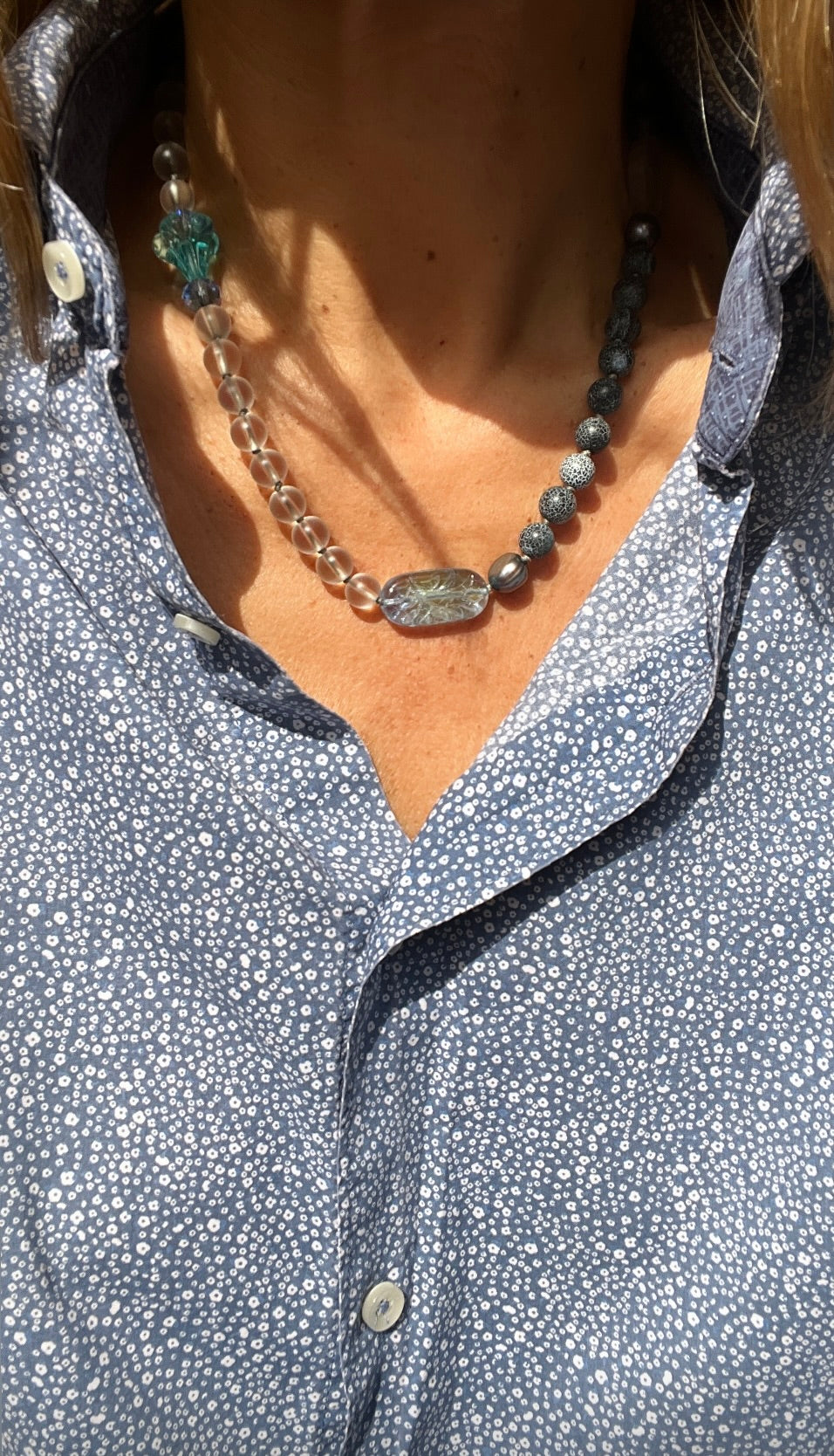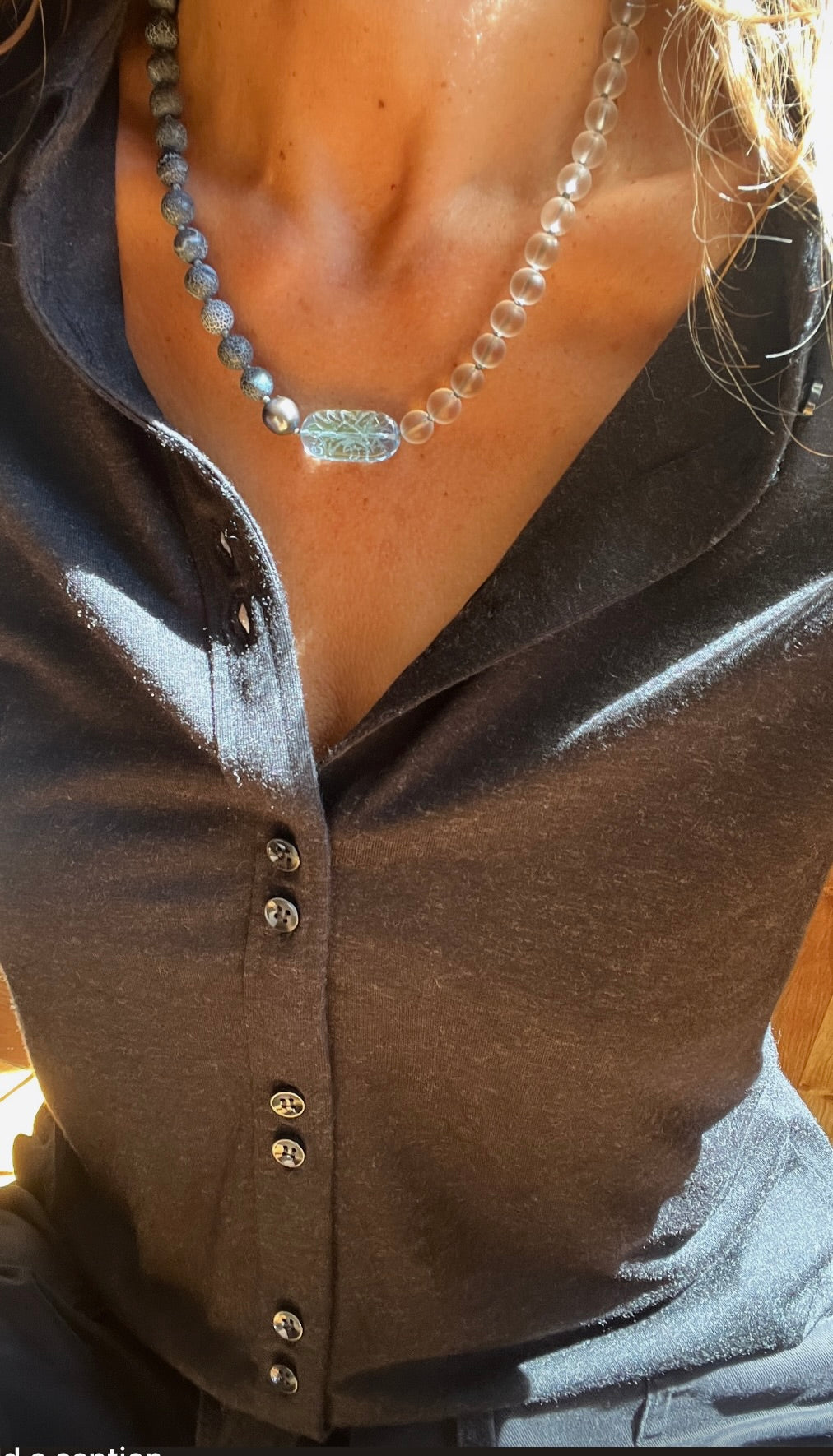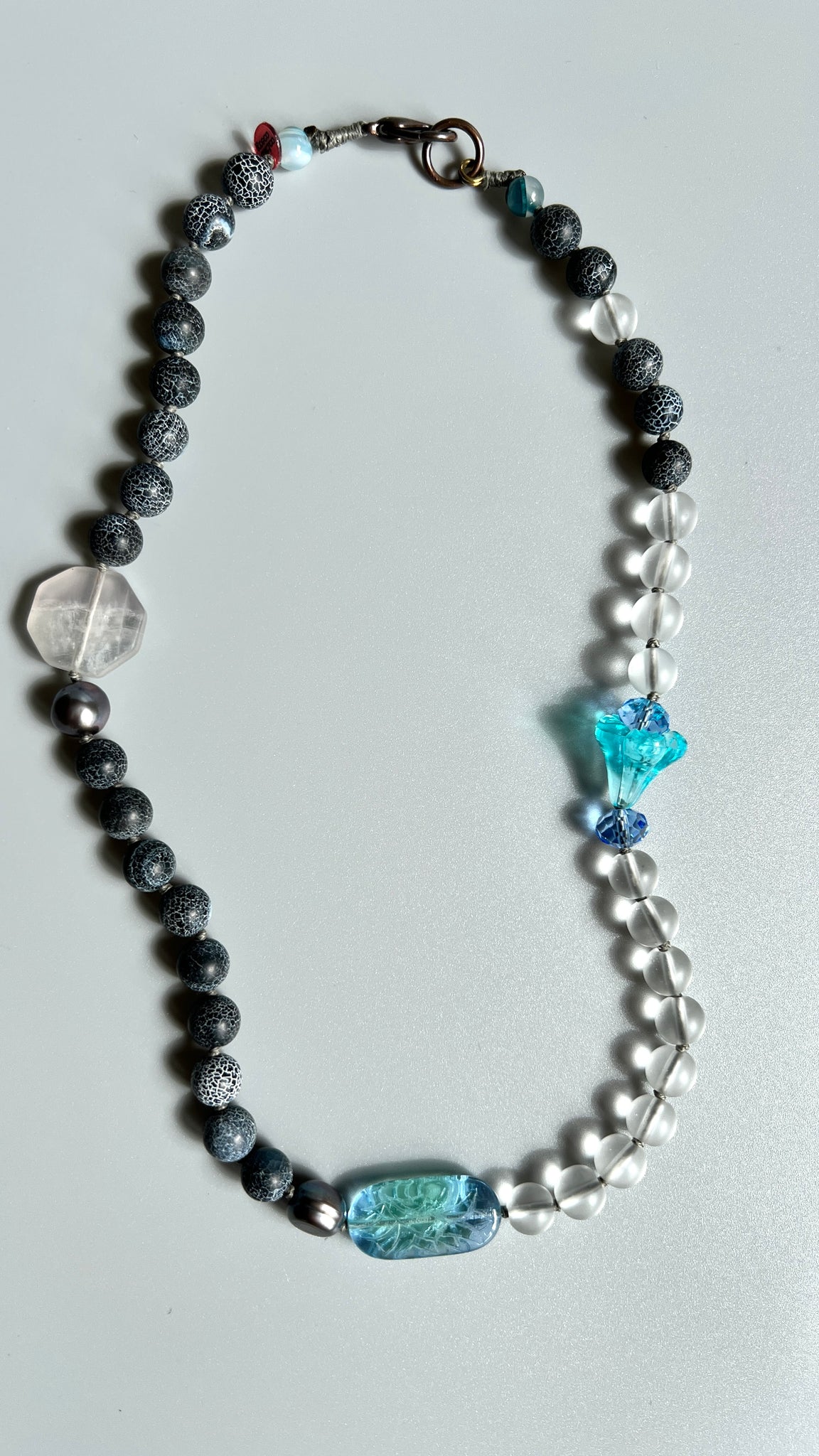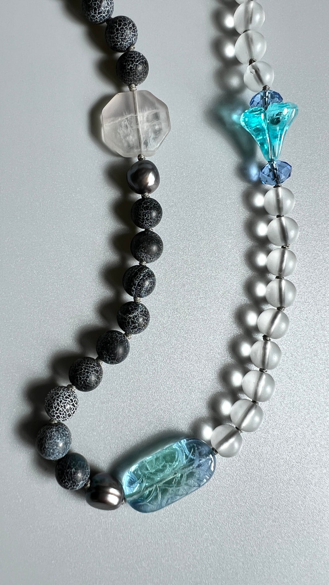 Unique handmade necklace featuring grey matte agates, quartz and transparent glass beads, with a curved oval vintage glass bead as a center piece. A necklace with a gentle appearance yet a strong character.