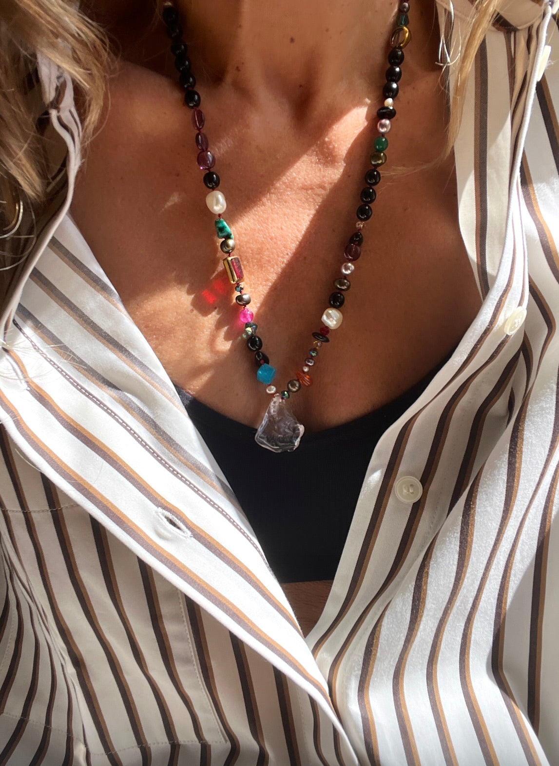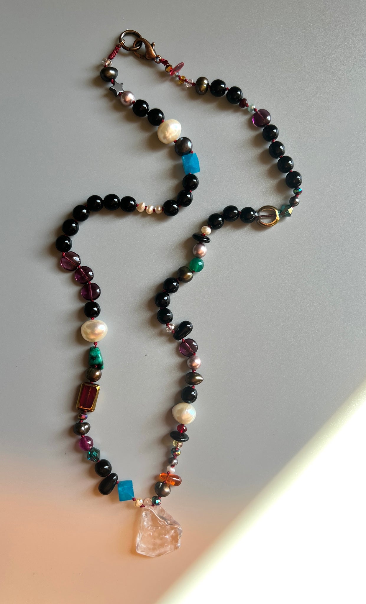 One - of - a - kind handcrafted necklace, made of glass vintage beads, fresh water pearls, crystals and a rose quartz centerpiece. This gemstone is cut in a raw shape, which radiates a gentle elegance that complements both everyday wear and special occasions. Each bead is separated by hand - tying knots.