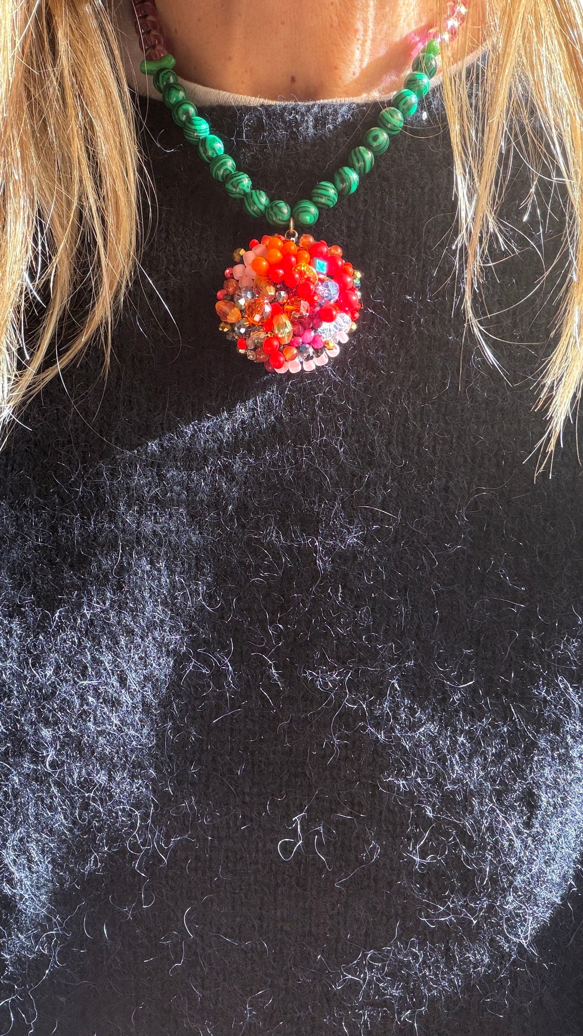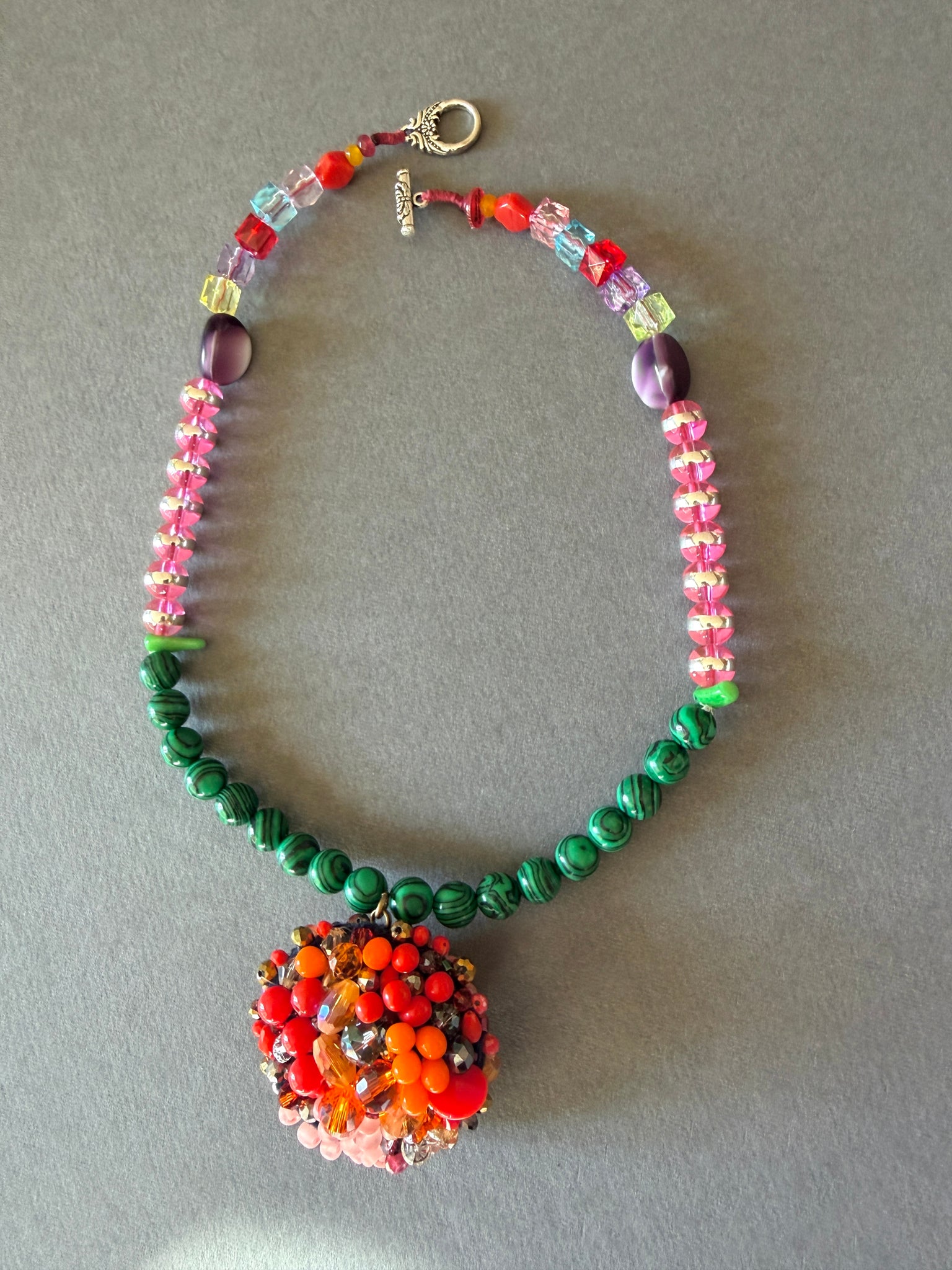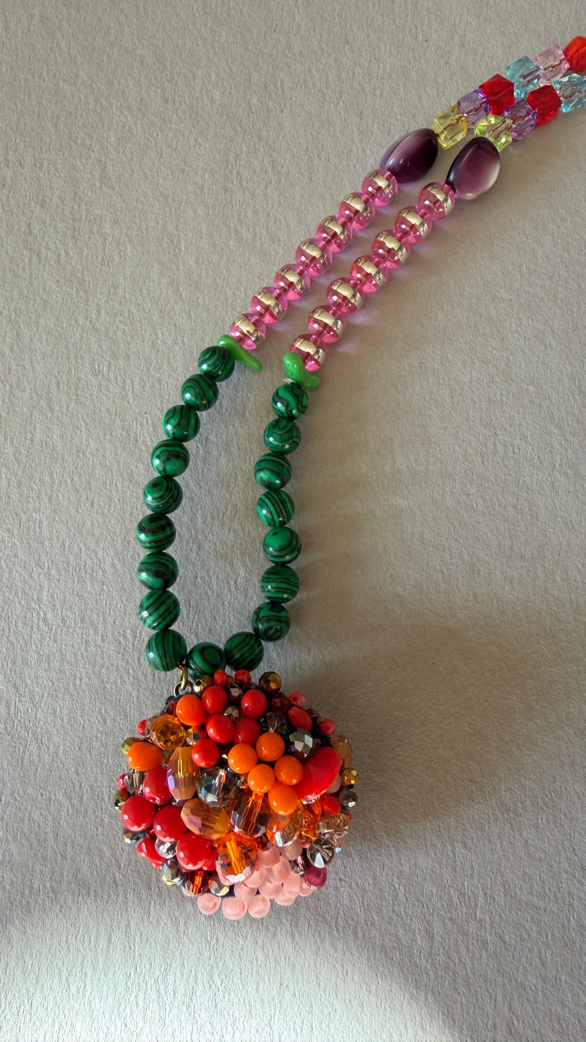 A unique necklace featuring a charm, where the vintage glass beads and the crystals are hand embroidered. The charm hangs from a strand of malachite stones glass and plastic beads, vintage and contemporary.