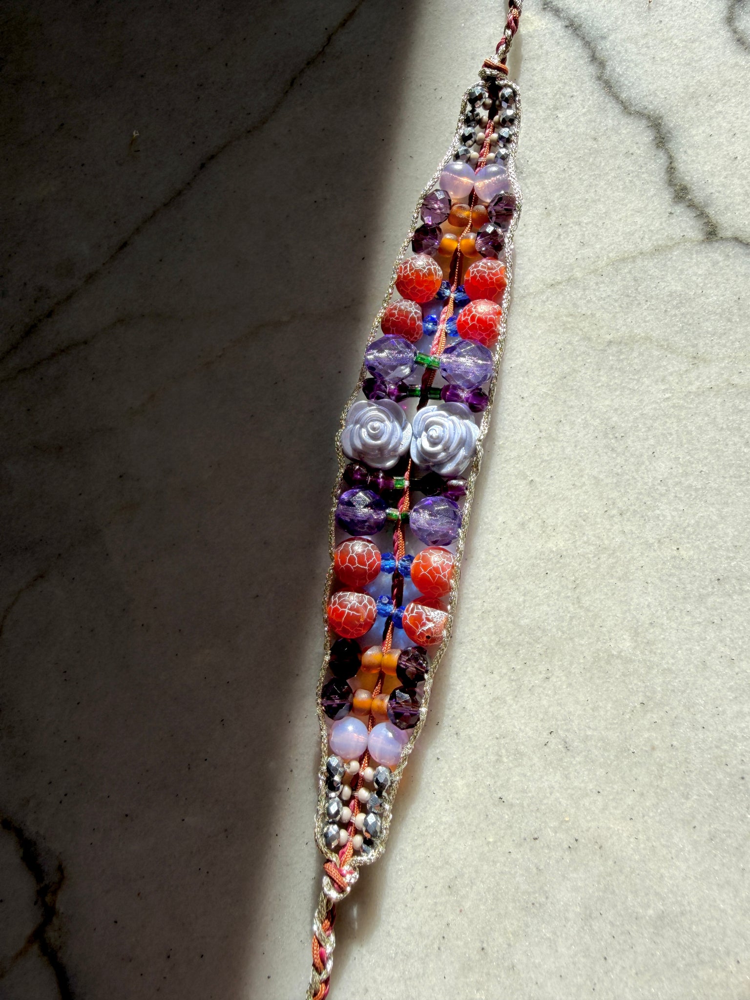 A delicate and one-of-a-kind bracelet made of glass beads, agates and crystals. At the center two rose-shaped beads give the piece character and style.