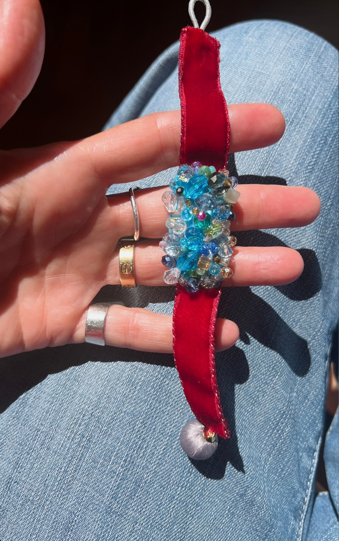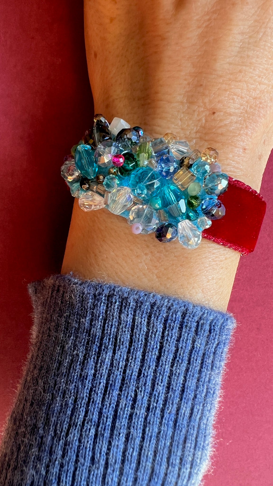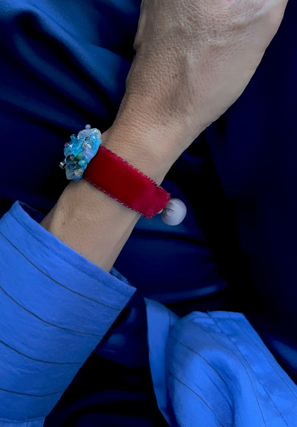Handmade bracelet crafted from soft velvet ribbon, sewn double, and adorned with embroidered crystals. It closes with a round satin button. A bracelet made entirely by hand, where the art of embroidery - a slowed meticulous process - gives value, uniqueness and character.