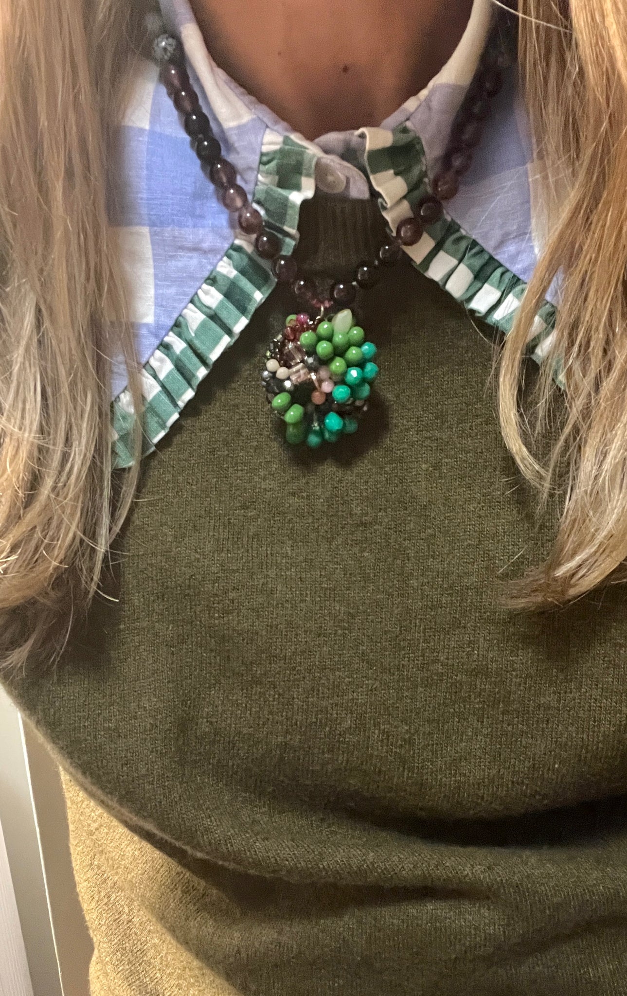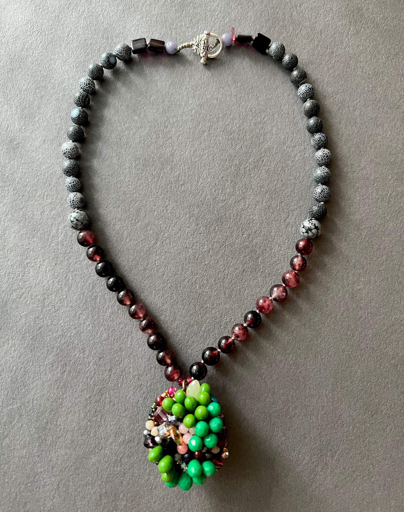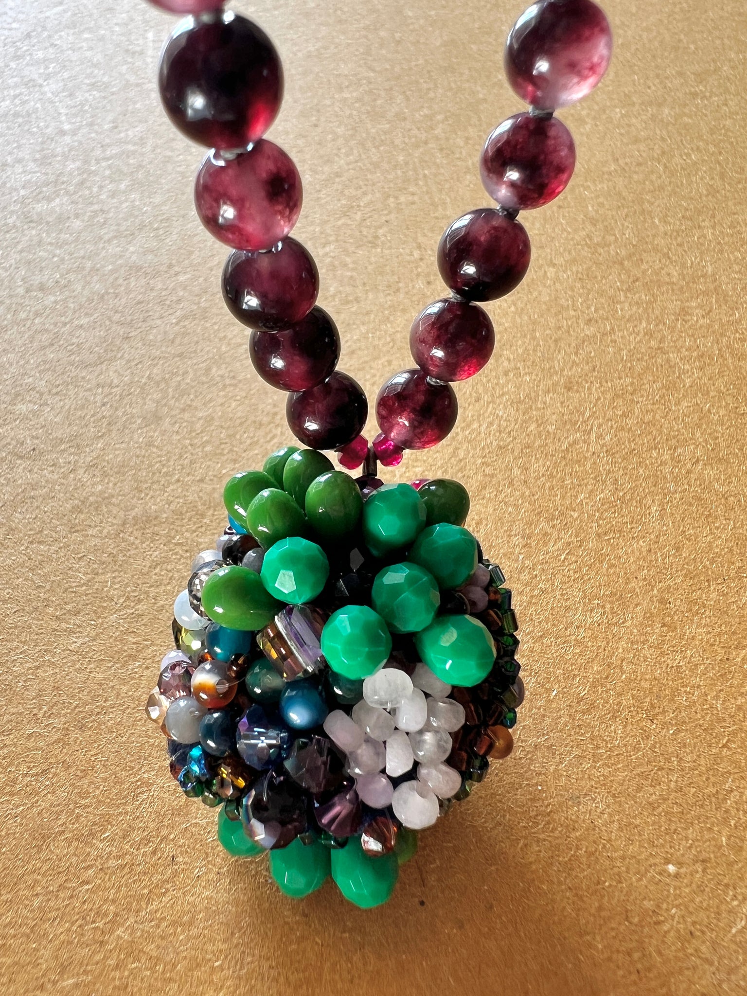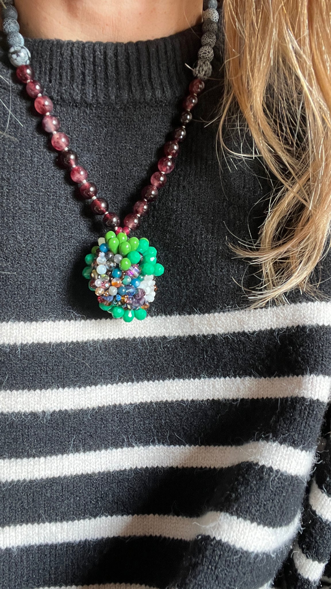 A three-dimensional handcrafted unique necklace that can be worn both sides. The pendant is hand embroidered with vintage beads crystals and semiprecious stones, while the rest of the necklace is made of natural agates.