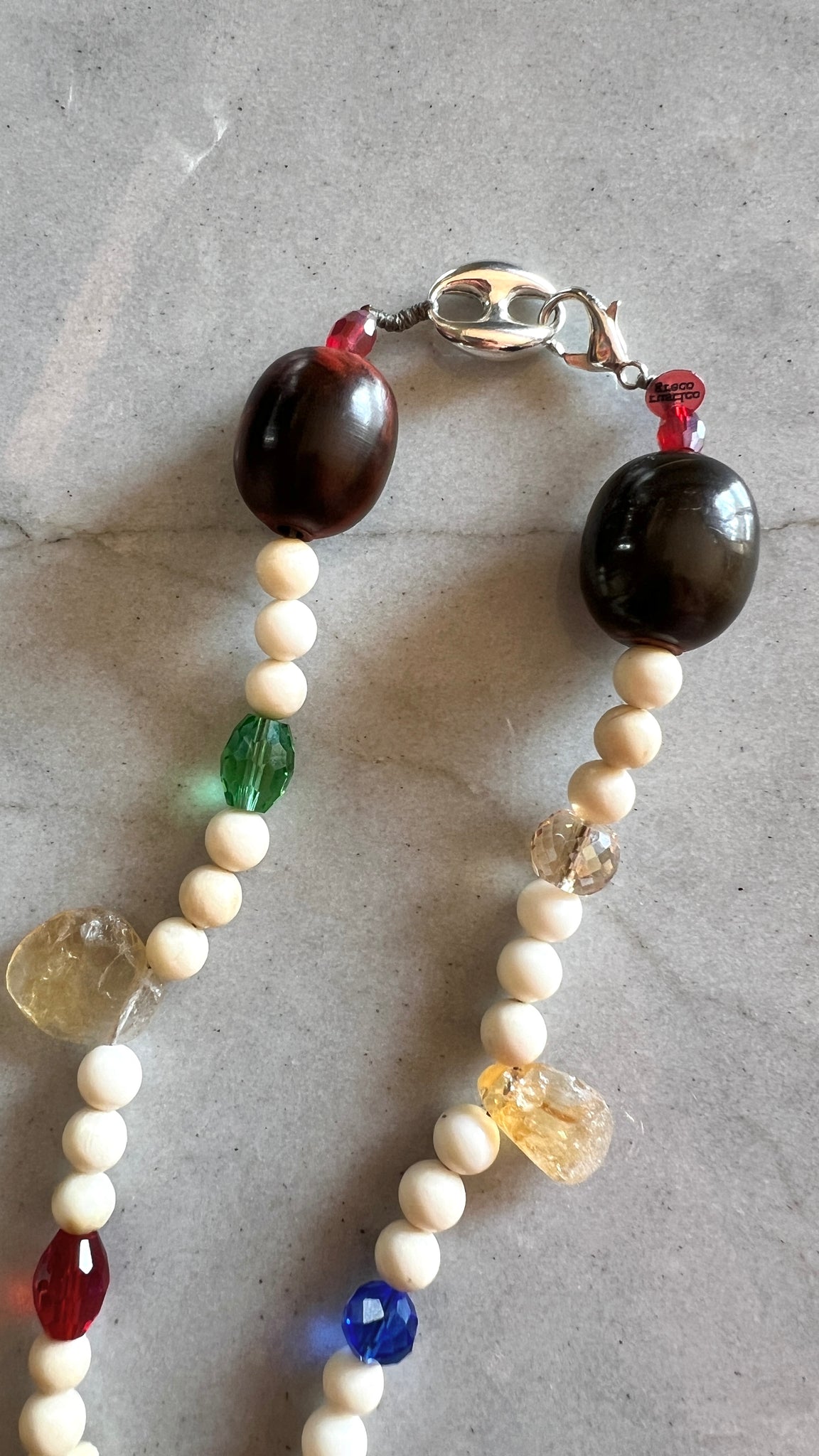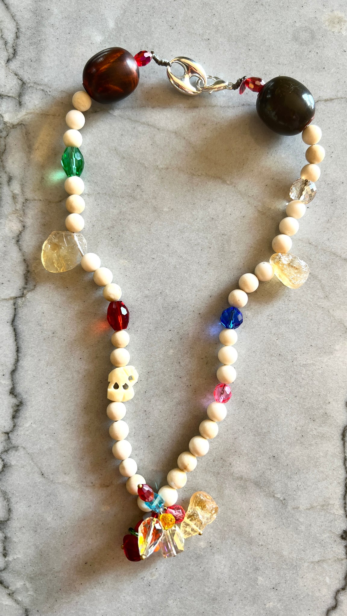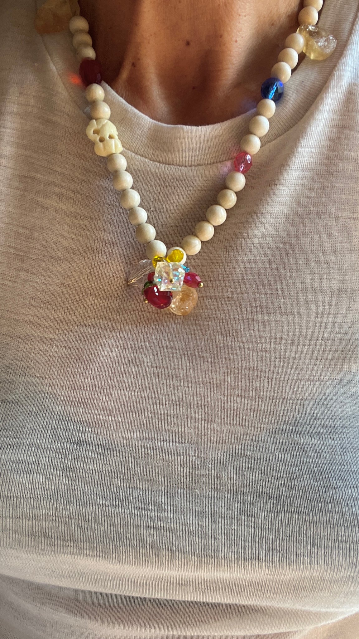 One - of - a - kind necklace made of jasper stones, quartz, crystals and an irregular bone - crafted stone.i t is finished with two large wooden beads and at the center hangs a charm crafted from quartz crystals and vintage beads.A distinctive and luminous necklace with character both bold and romantic.
