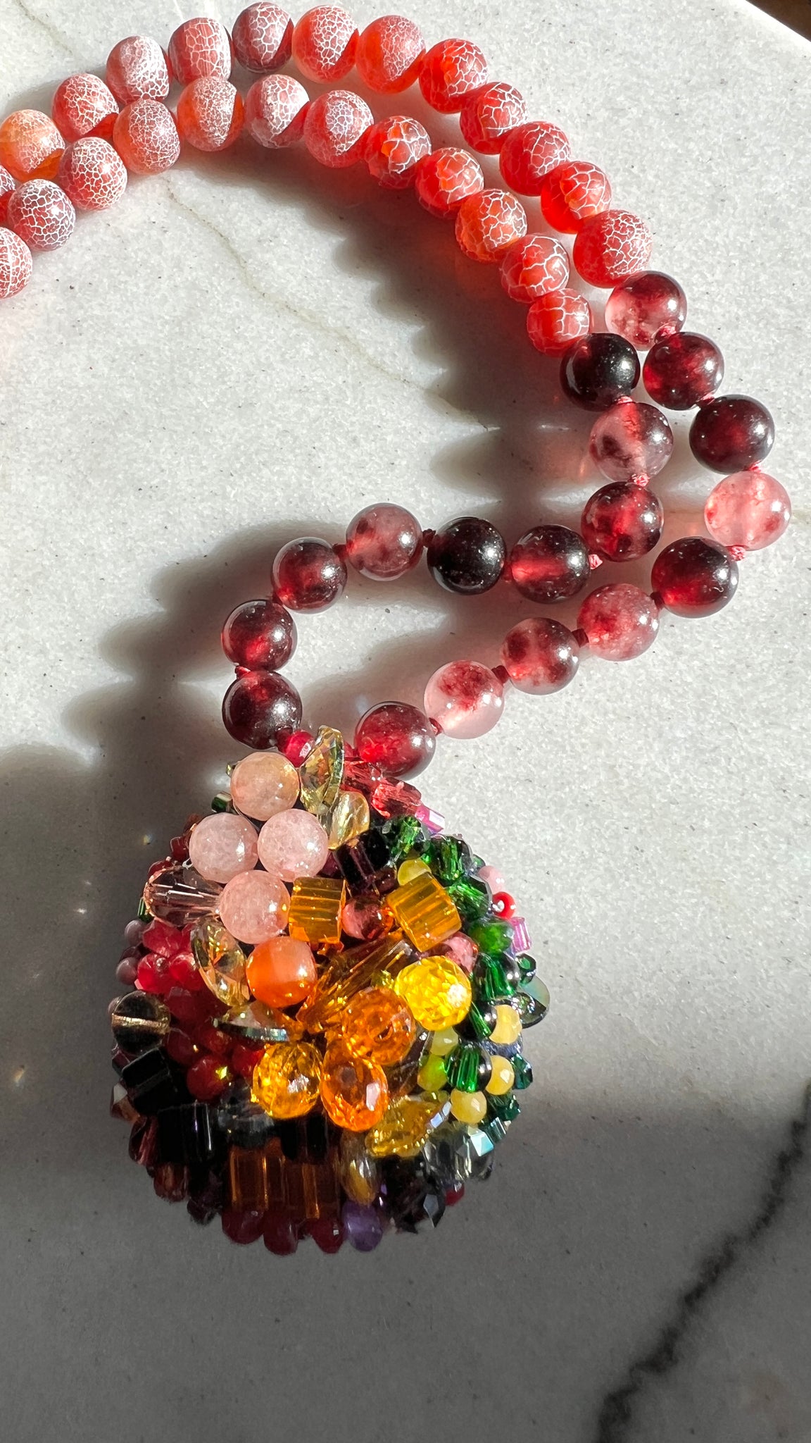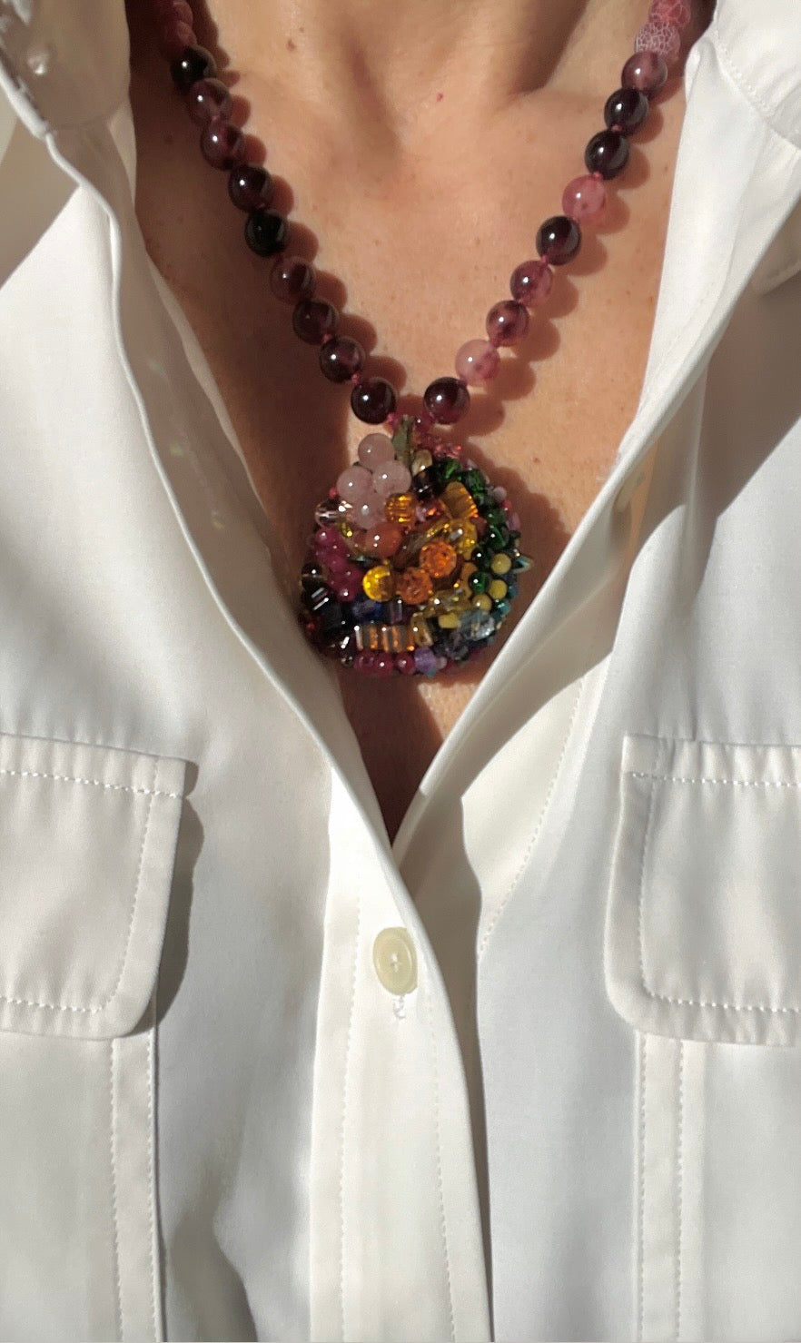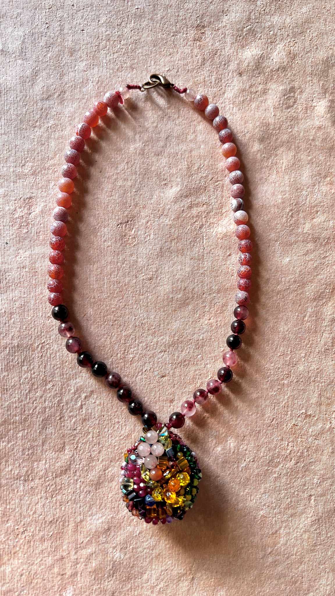 A three- dimensional handcrafted unique necklace that can be worn both sides.The pendant is hand embroidered with vintage beads, semiprecious stones and crystals, while the rest of the necklace is made of agates.