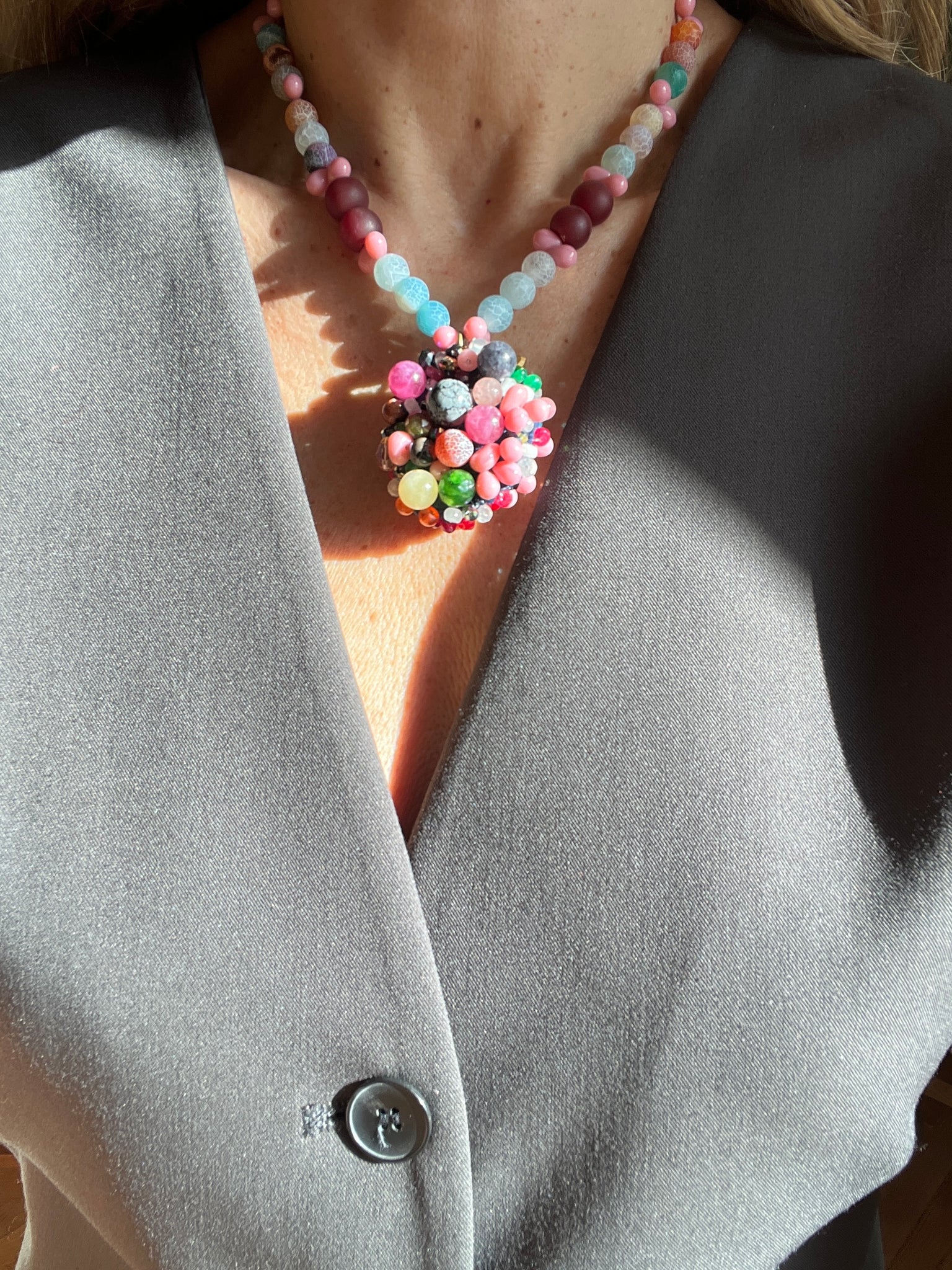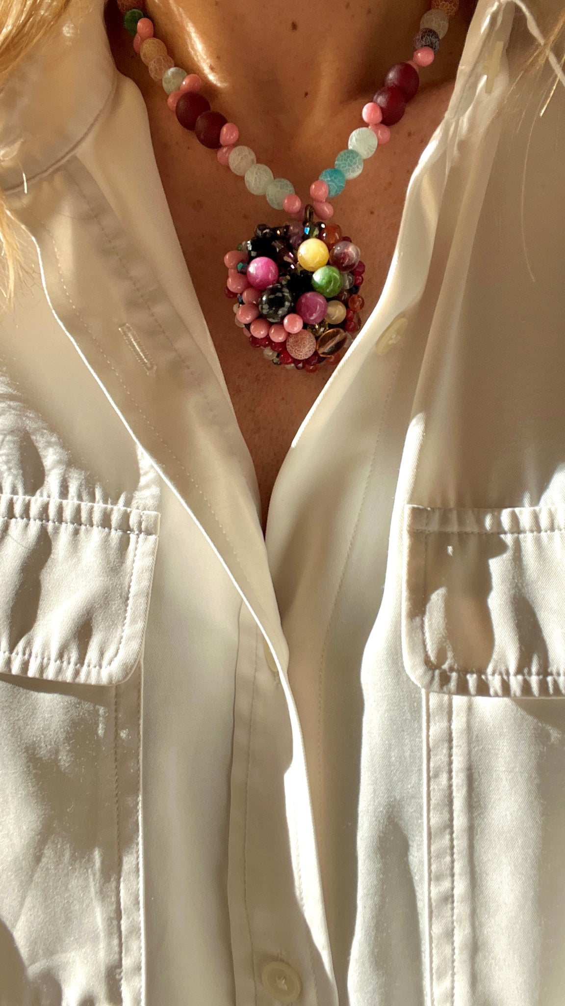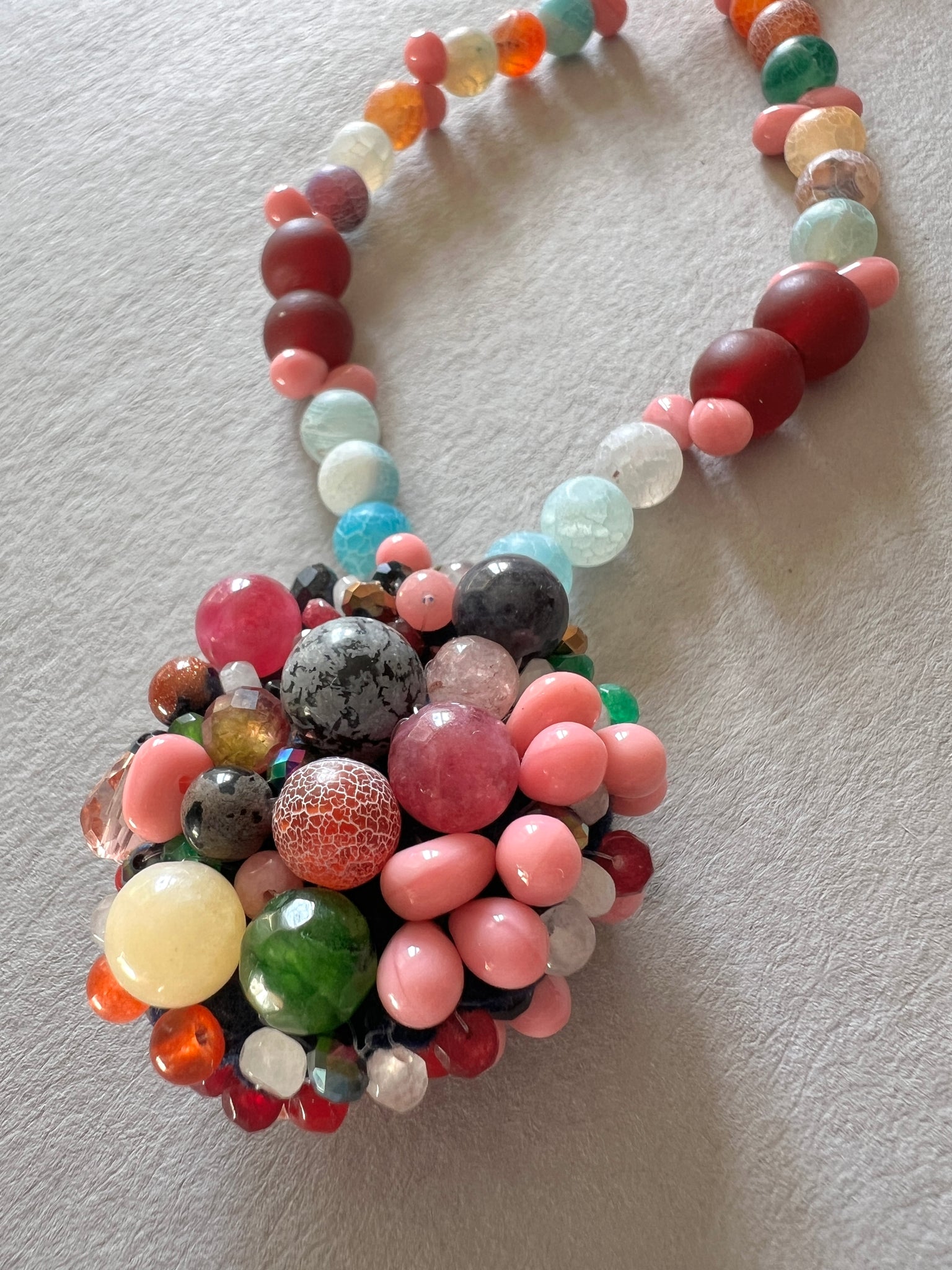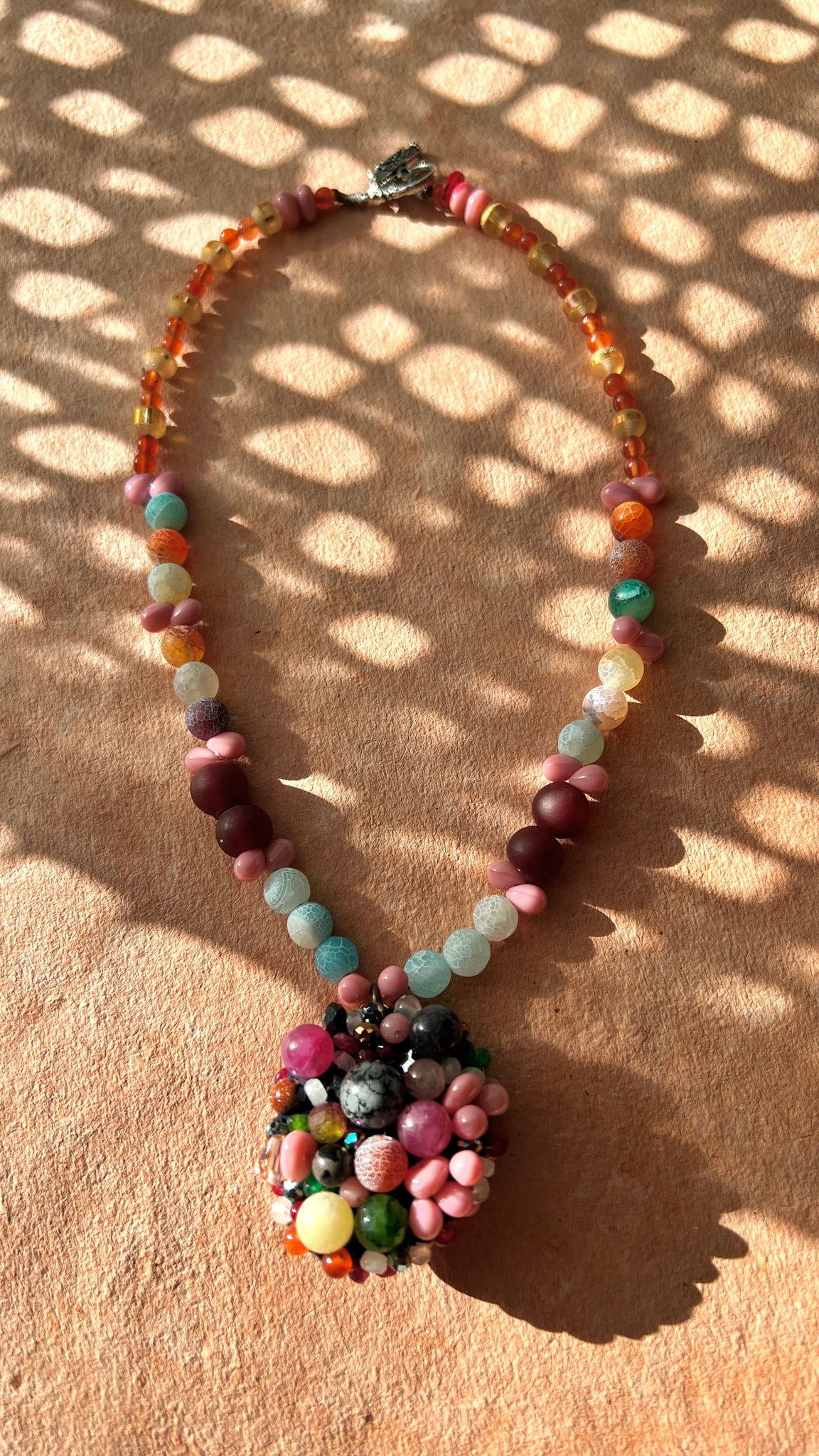 A unique necklace featuring a charm, where the multi- coloured agates, crystals and vintage beads are hand embroidered. The charm hangs from a strand of matte multi-coloured agates and vintage glass beads.