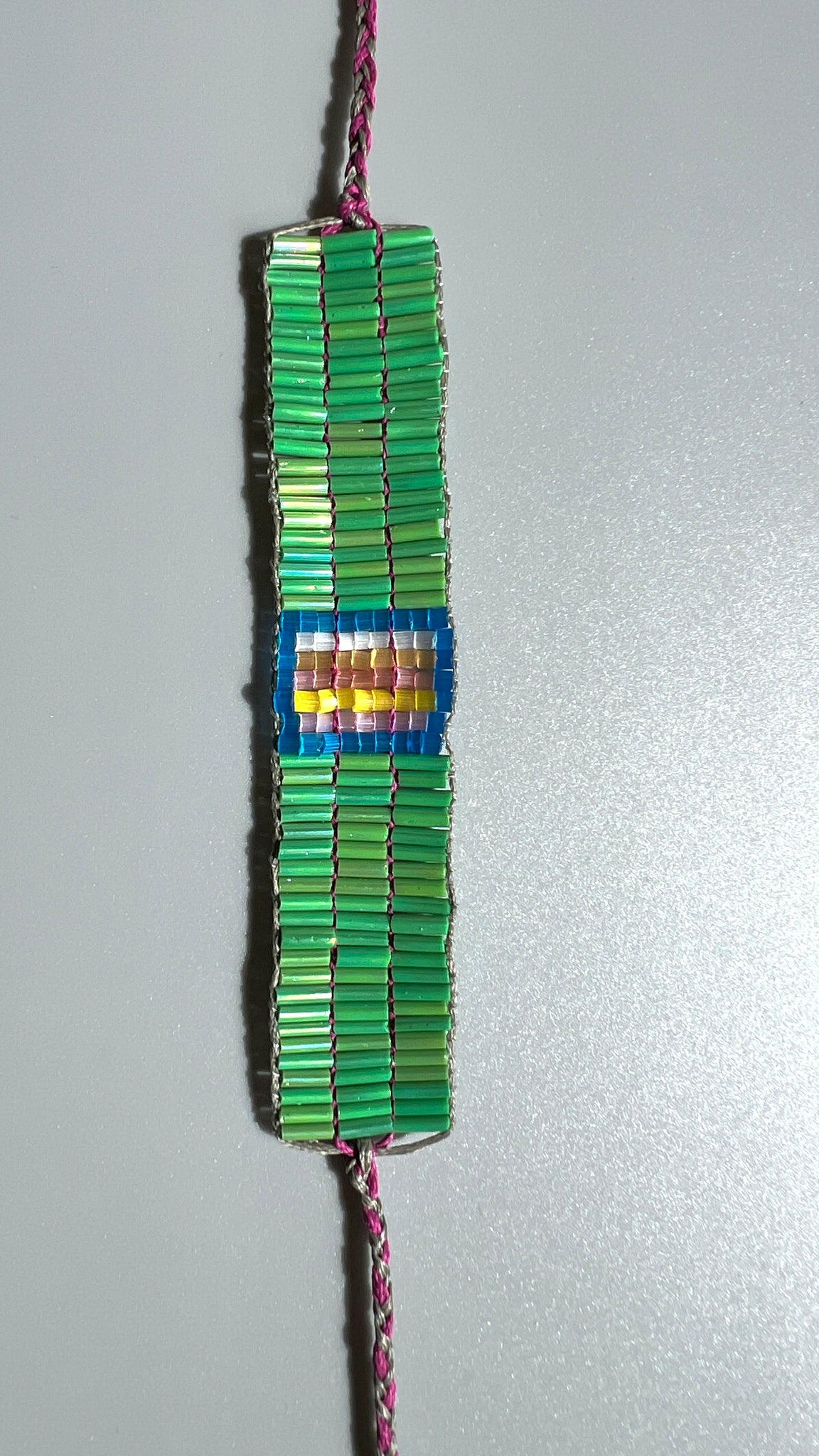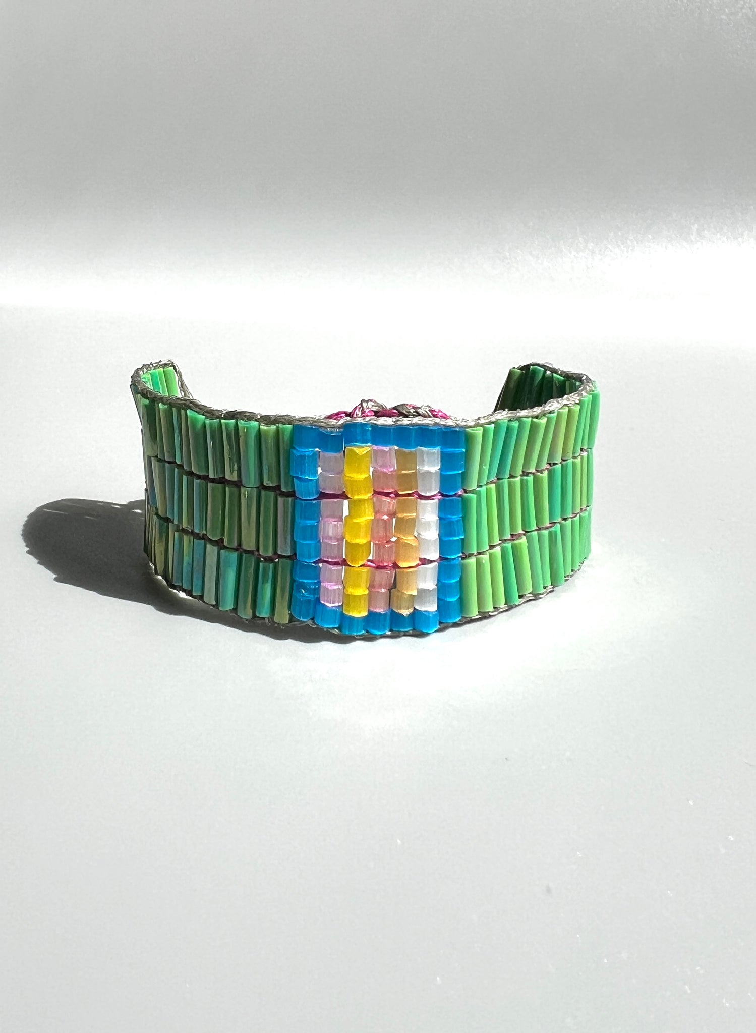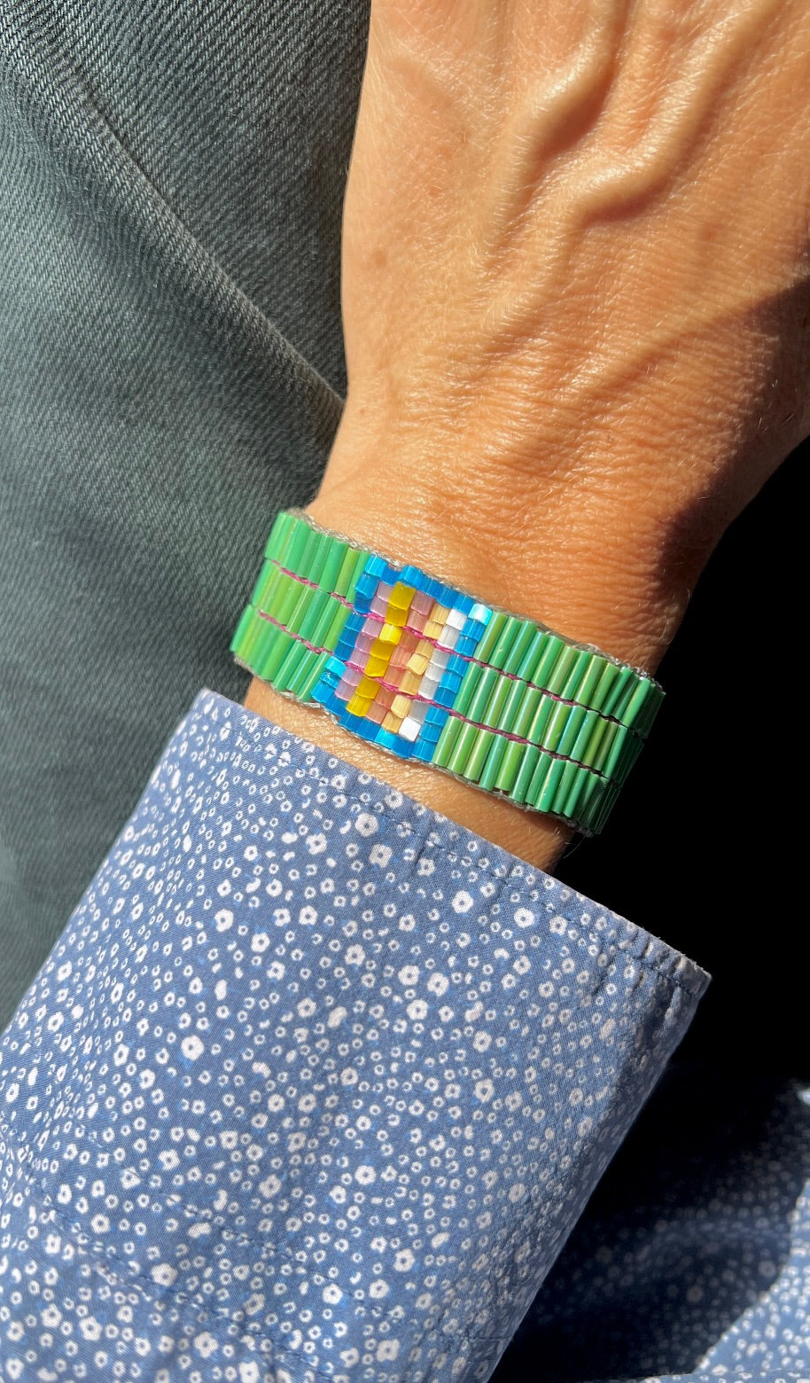 A delicate and fine bracelet, handmade from glass baguette beads. It is ultra lightweight and deluxe and adapts the wrist with elegance, becoming like a second skin with a bold character.