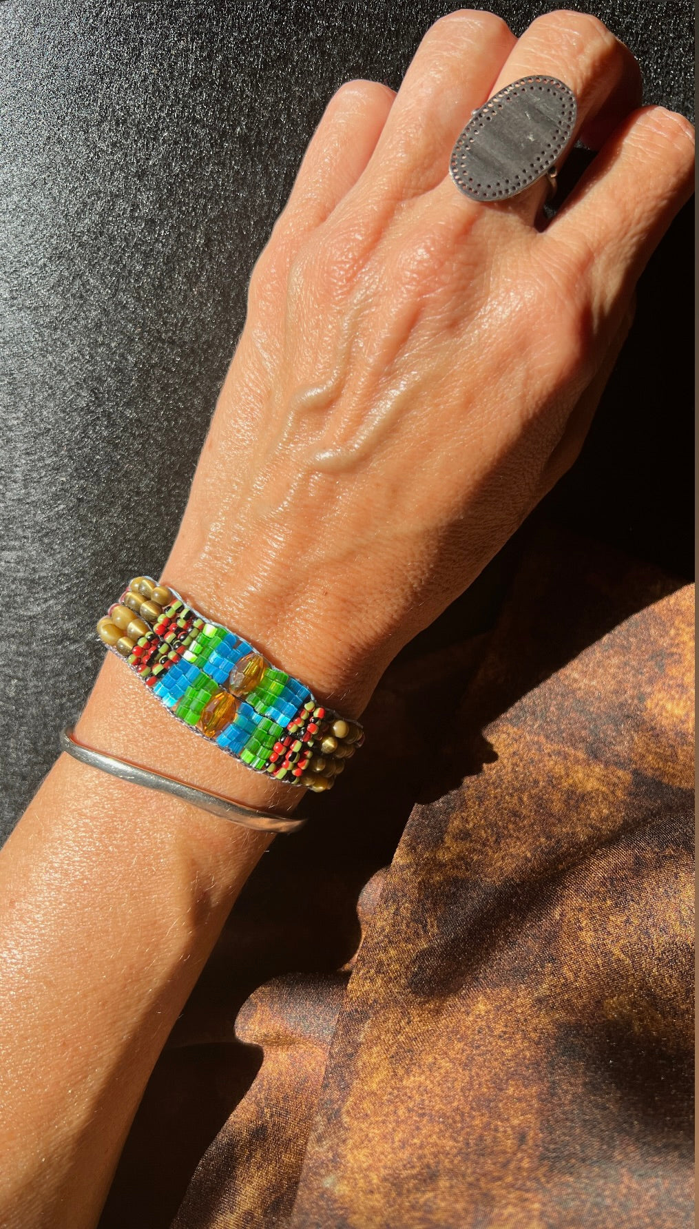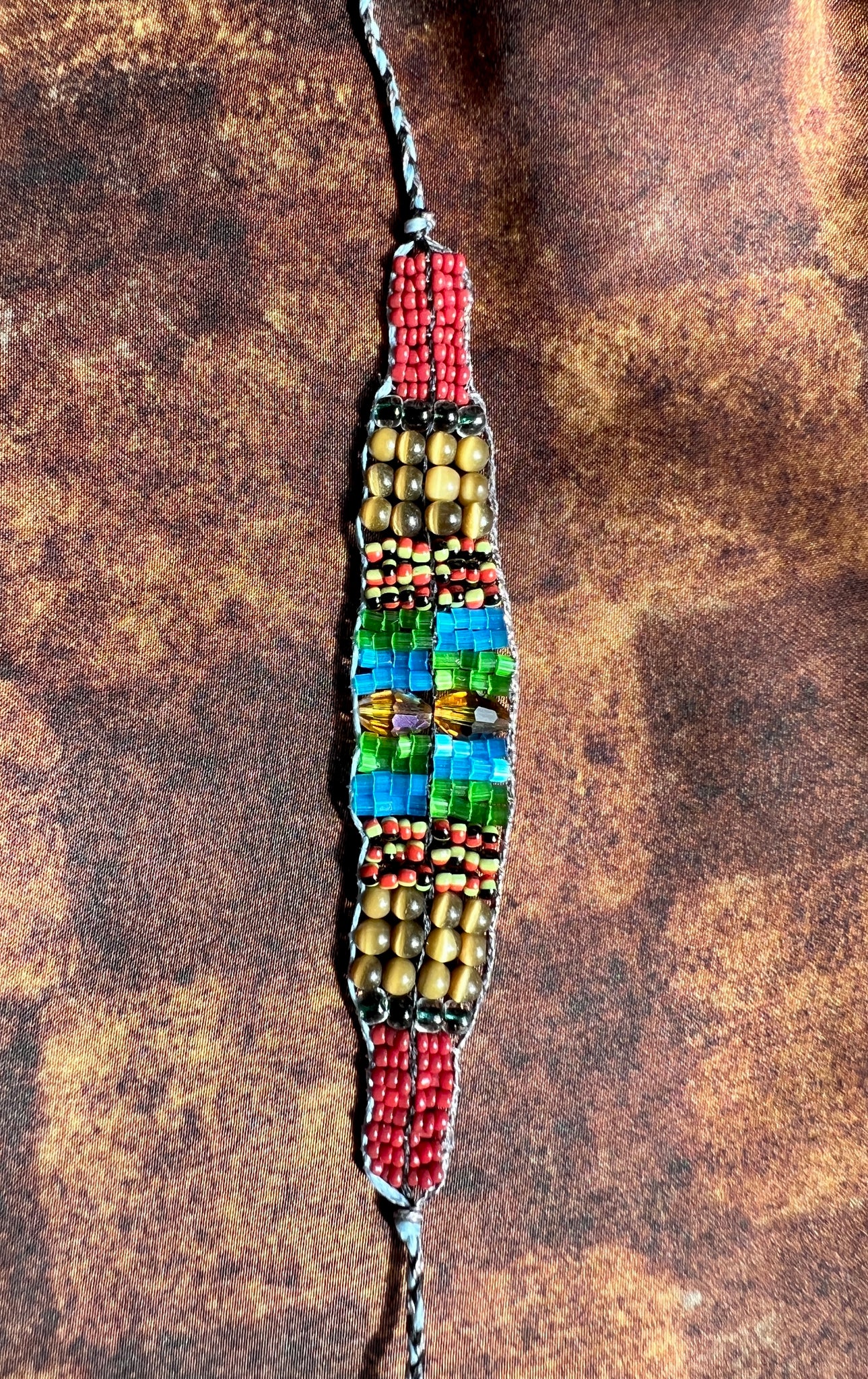 Unique handcrafted bracelet made with vintage and contemporary beads. The earthy hues meet the vibrant blue to create depth and texture.