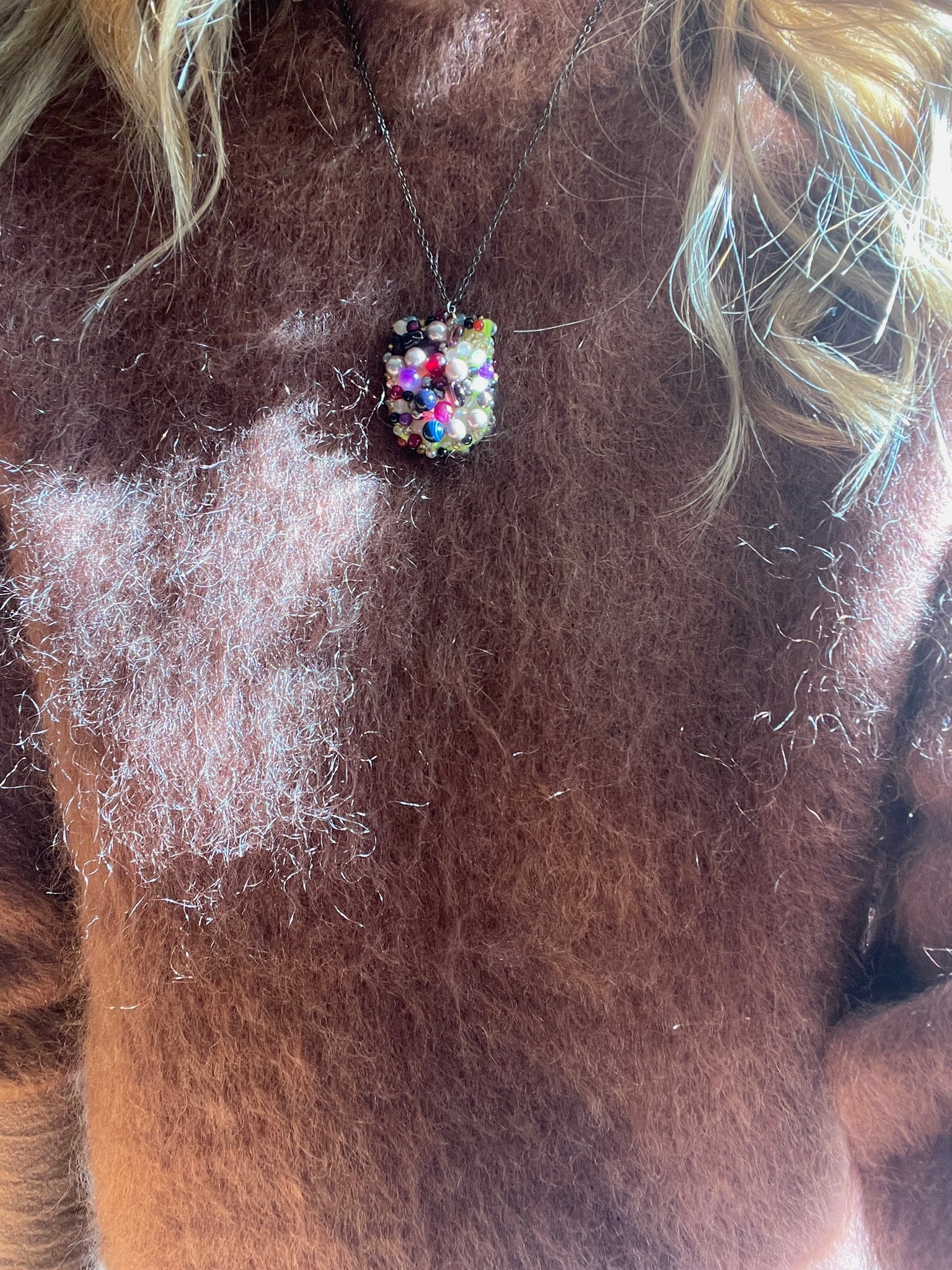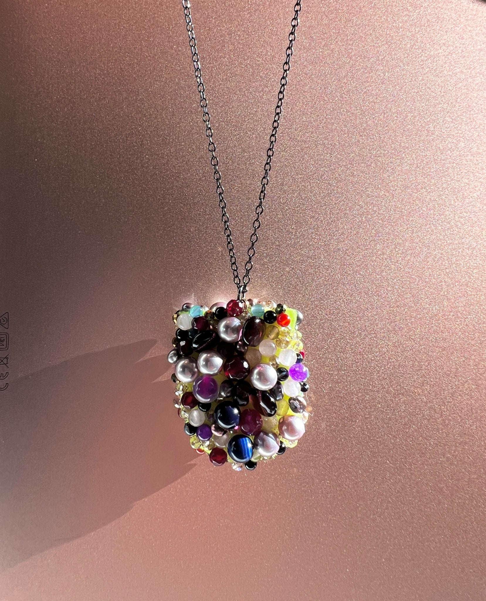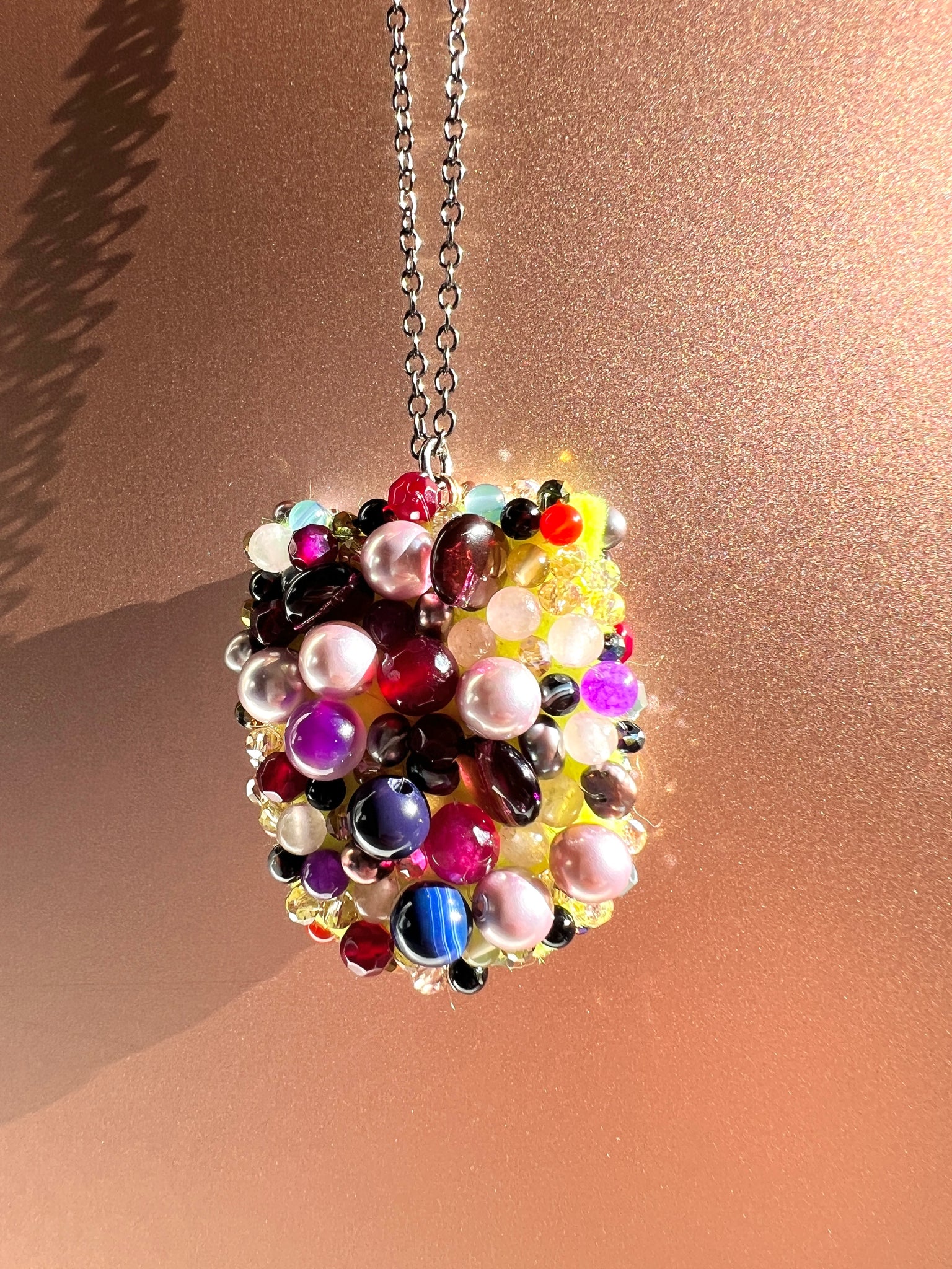 A three- dimensional hand-embroidered pendant made of semiprecious agate stones, freshwater pearls, crystals and vintage beads, in purple and wine tones. It comes with a silver, rhodium-plated chain.