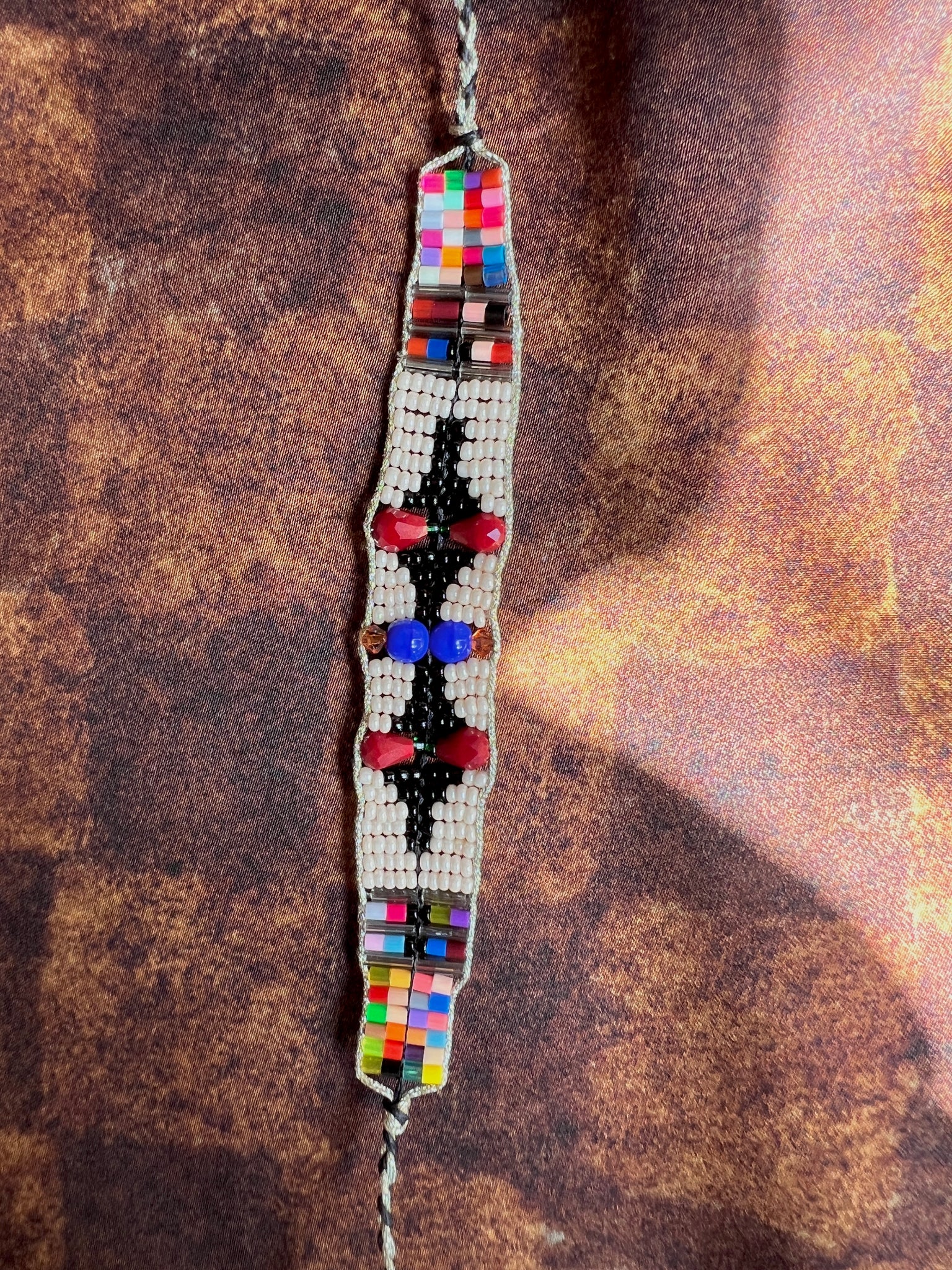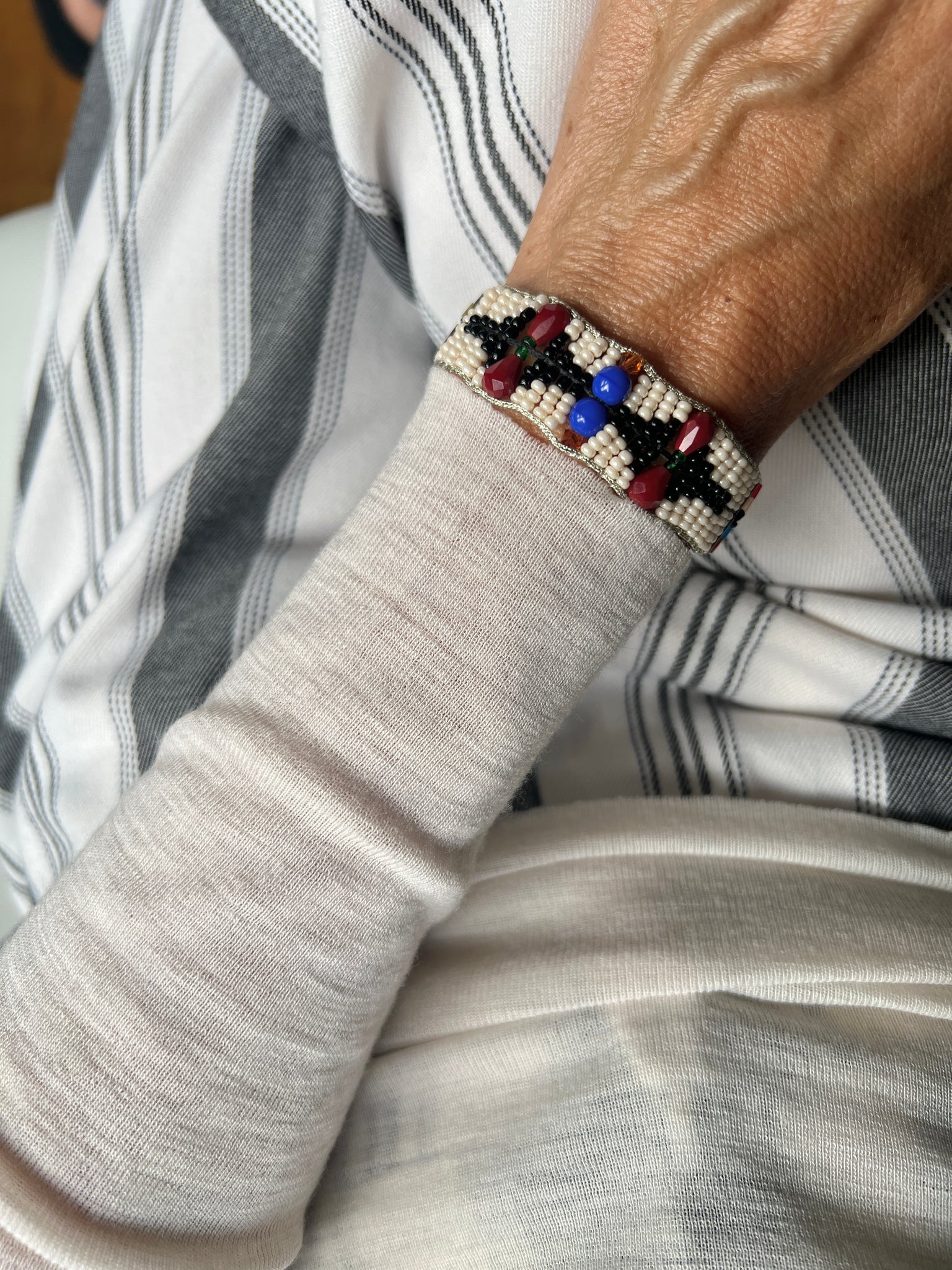 Unique bracelet made of glass and multicoloured plastic beads, featuring patterns inspired by the traditional bold geometric shapes of the Southwestern style. A lightweight, stylish bracelet that's easy to wear.