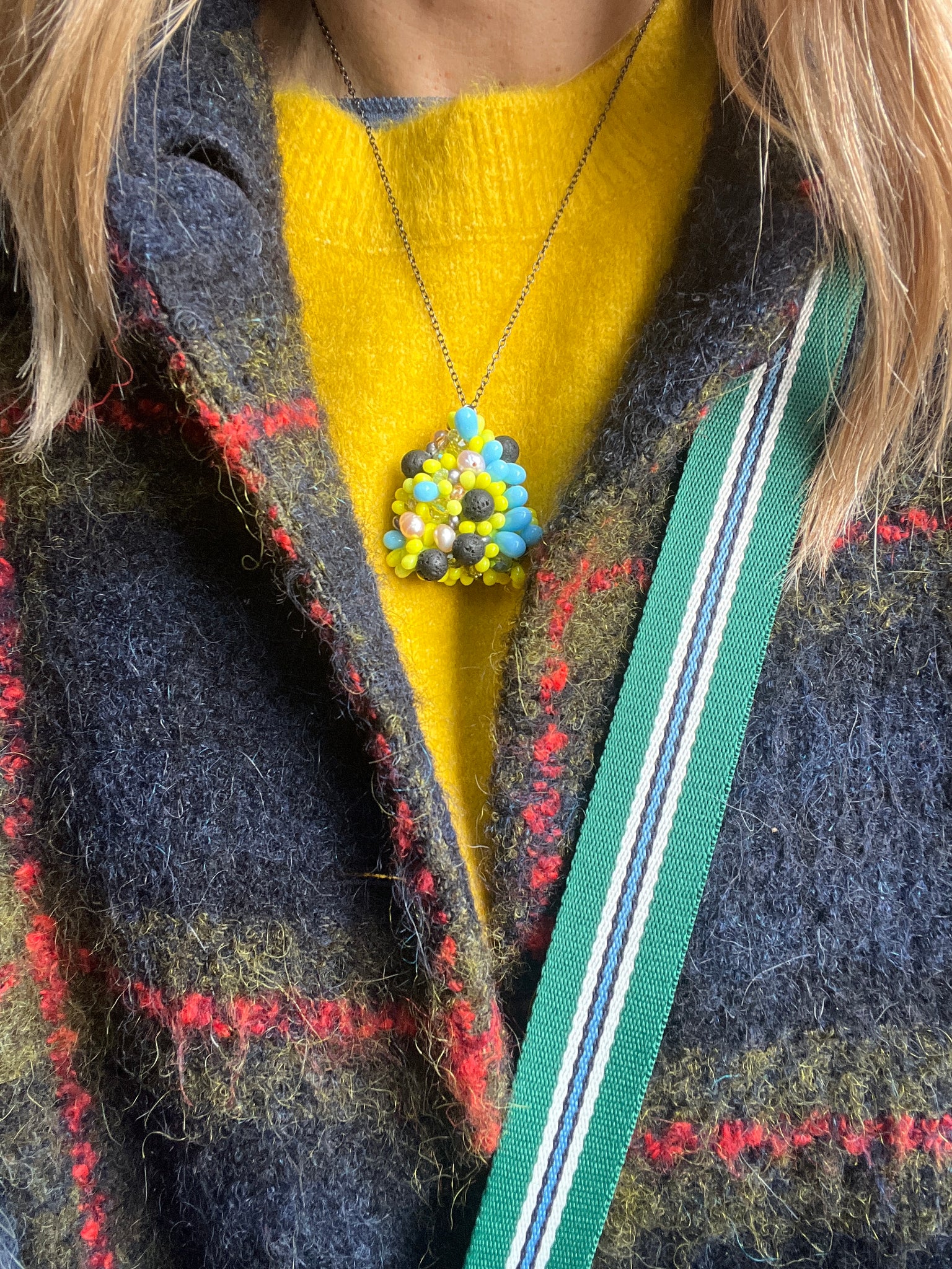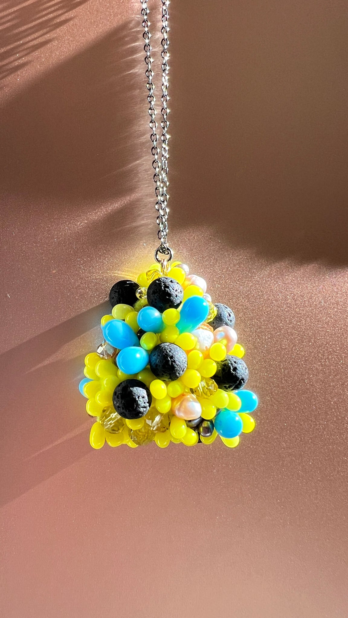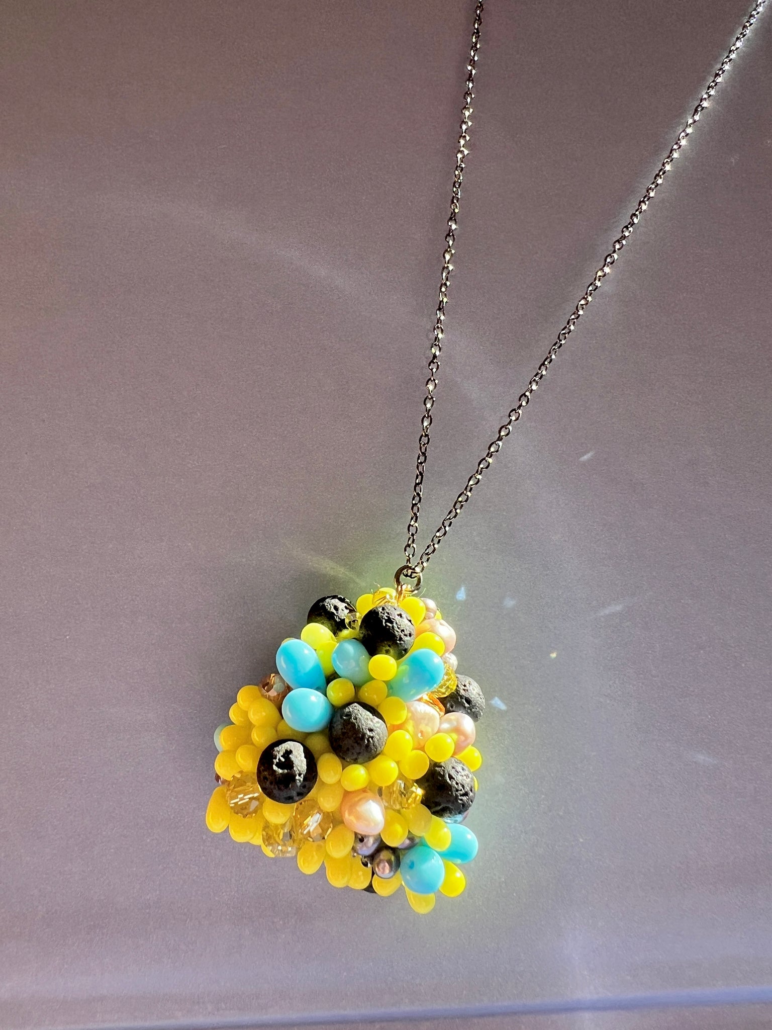 Unique hand embroidered pendant. A playful accessory featuring vintage teardrop-shaped glass beads, black lava, crystals and fresh water pearls. This pendant has an extraordinary three-dimensional look that uplifts your mood. Stylish and full of character. It hangs from a Rhodium-plated 925 sterling silver chain.