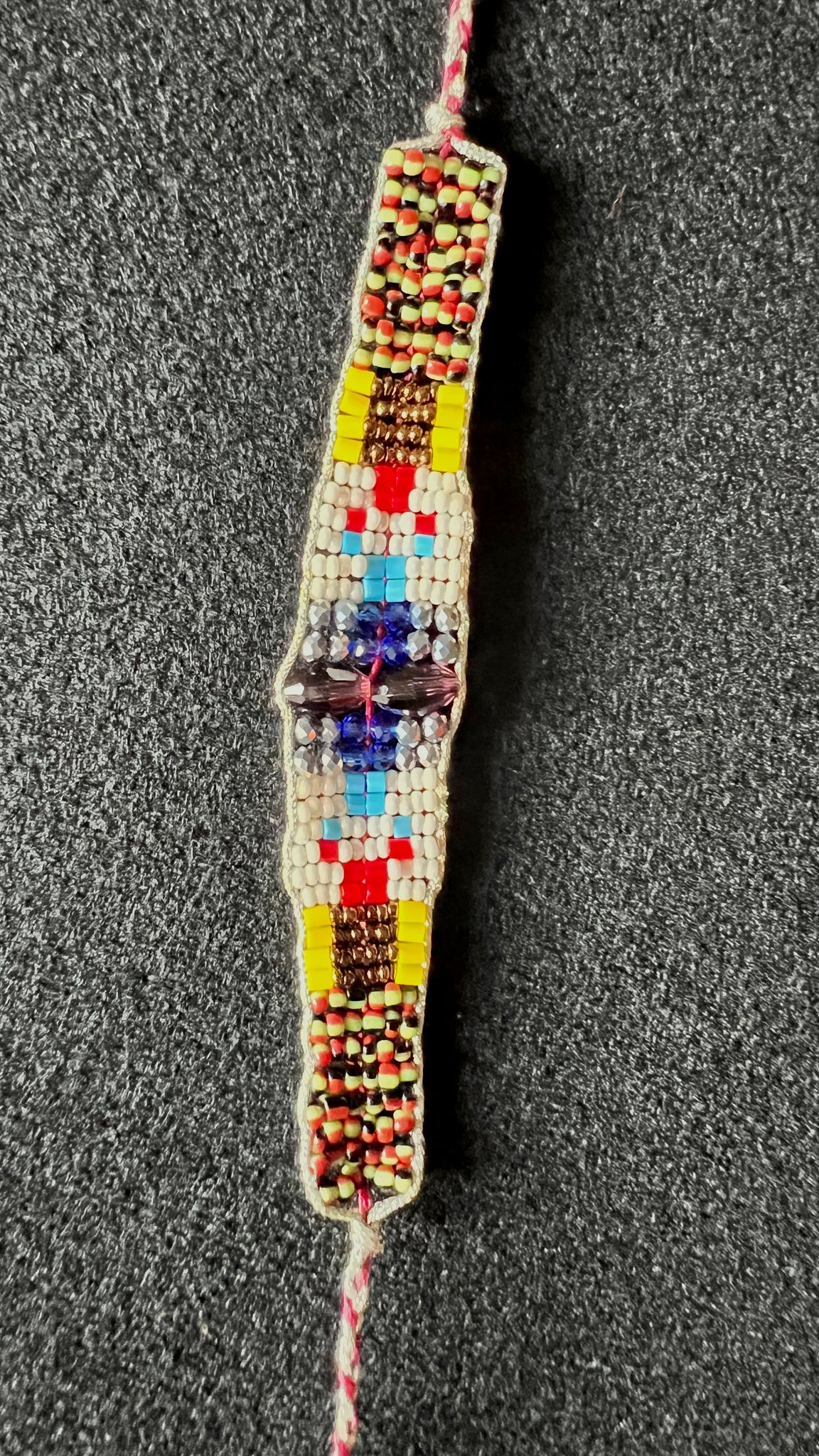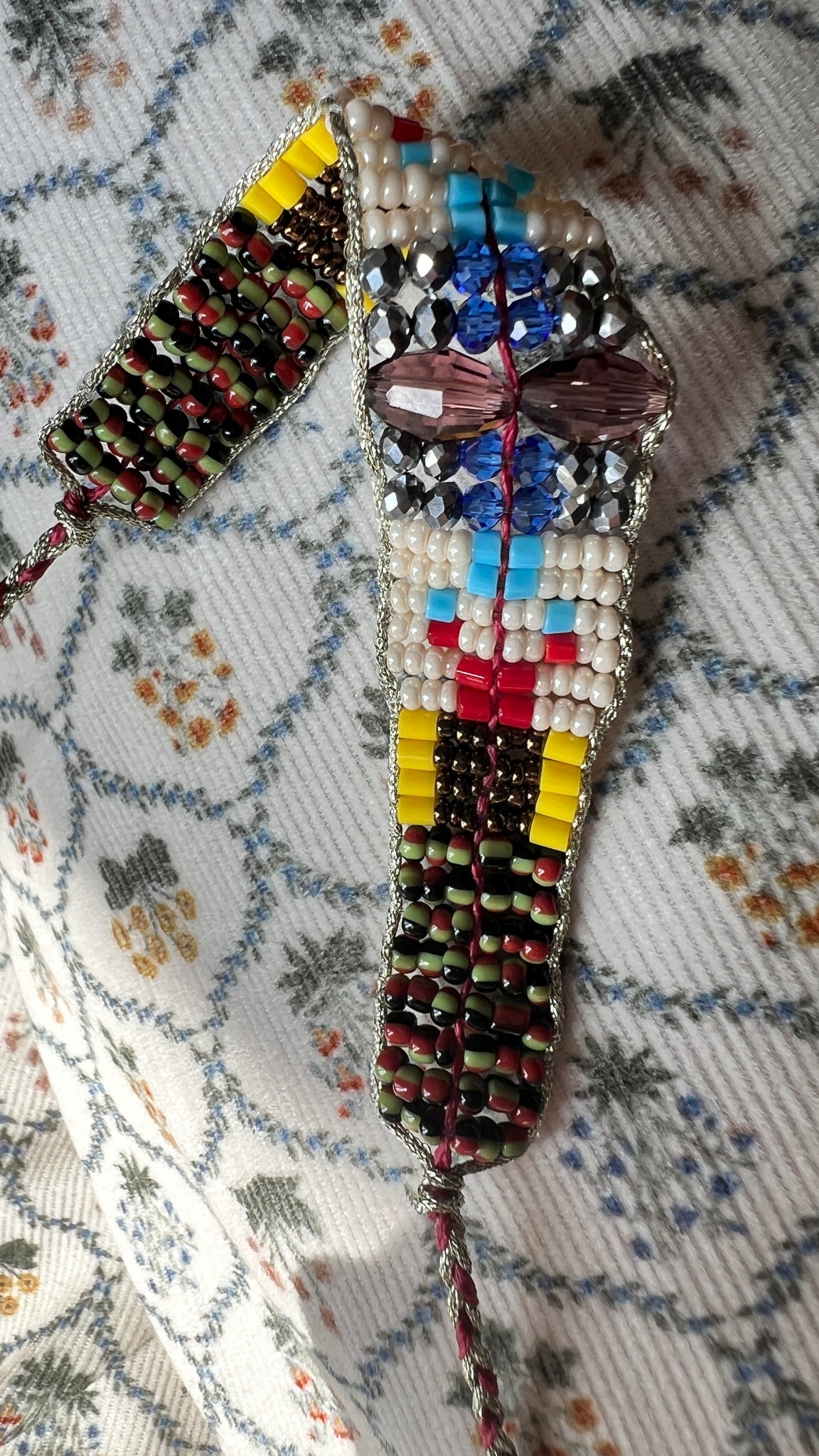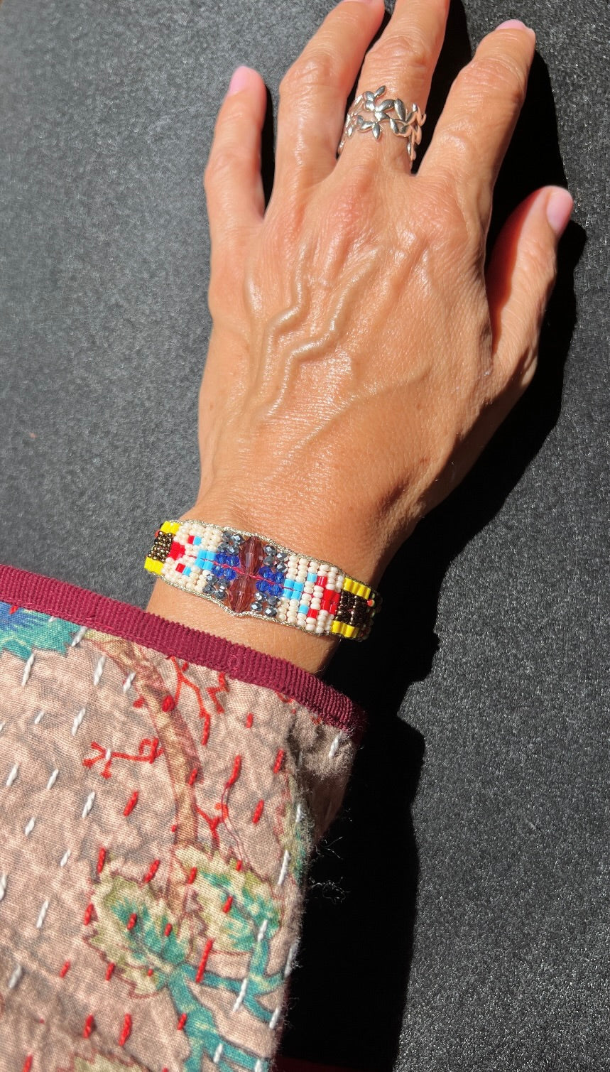 Unique handcrafted bracelet made with glass beads and crystals. Its delicate beads, with their blended shades and the geometric design, create the impression of embroidery.