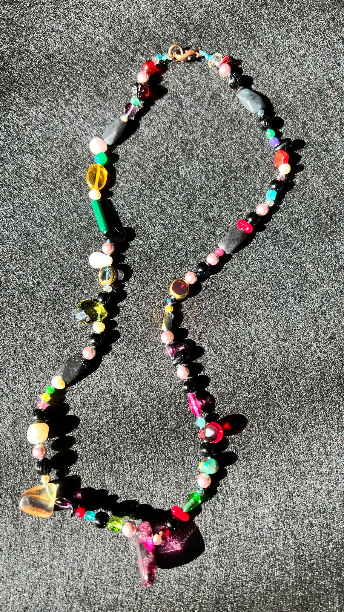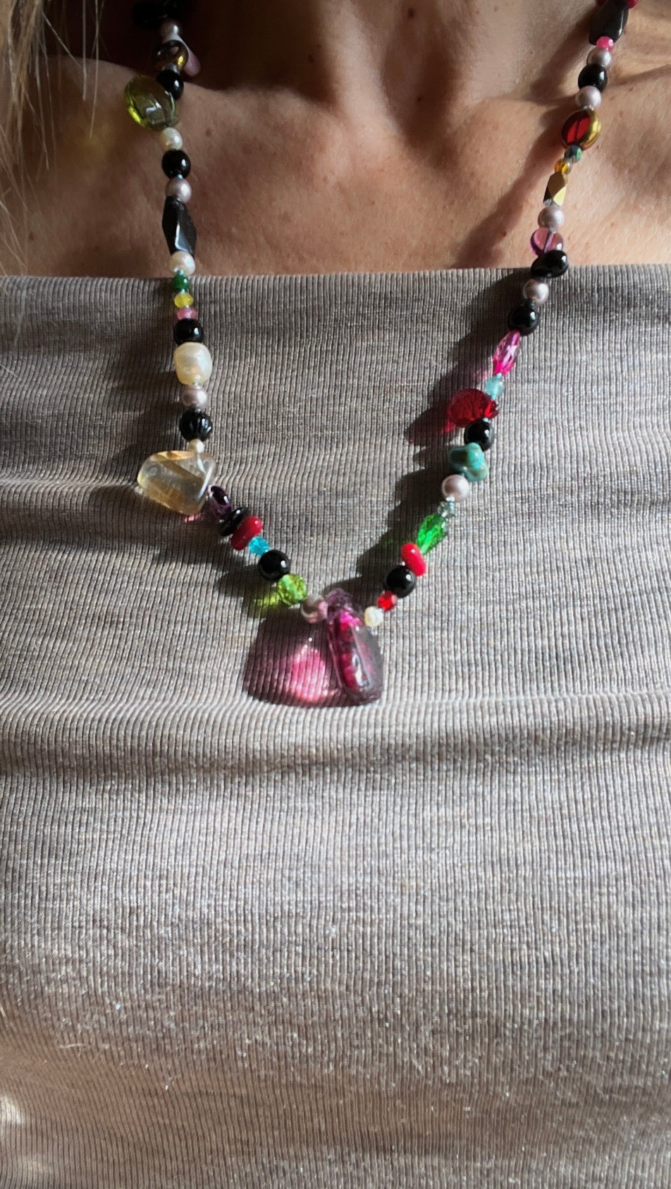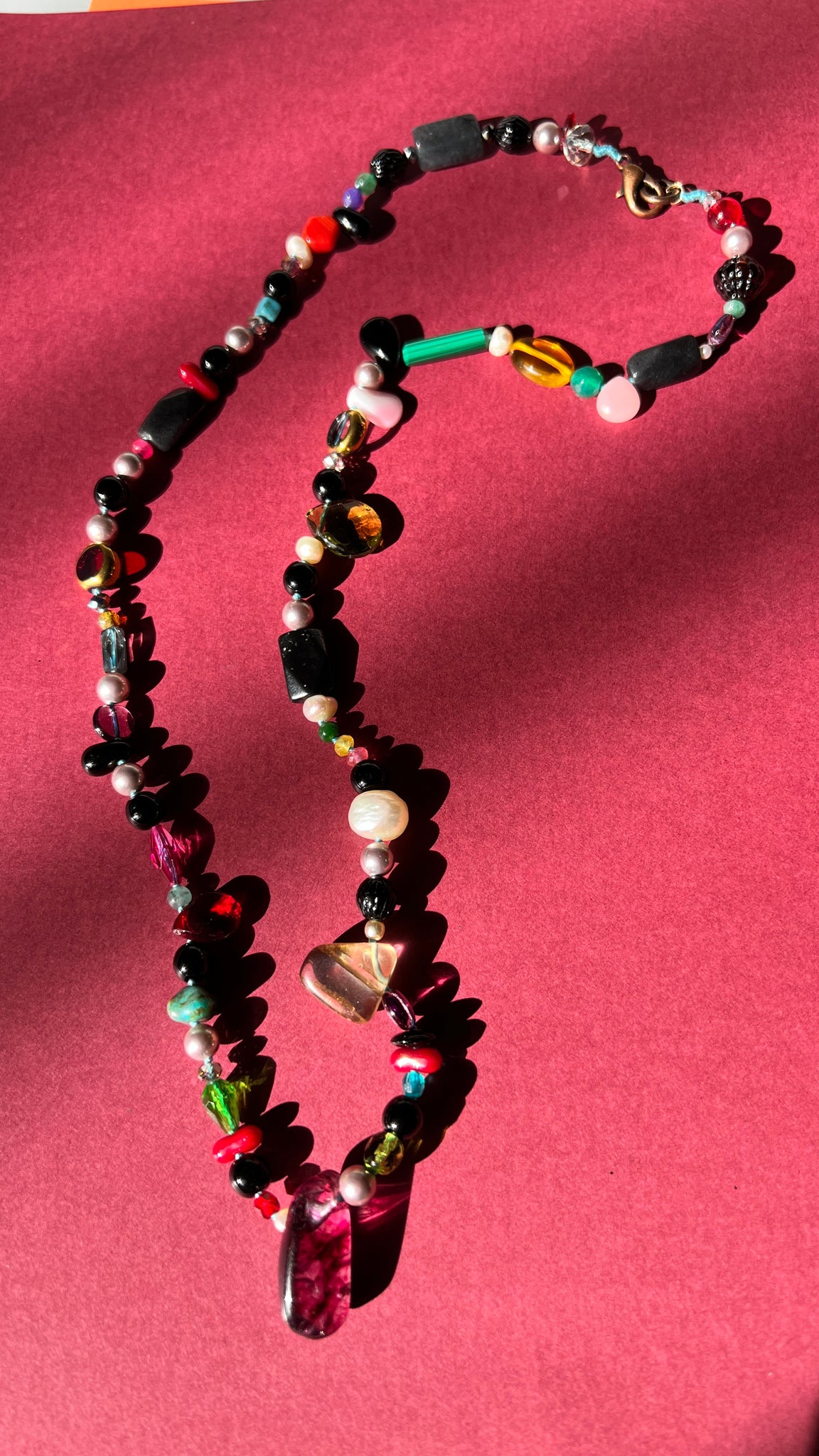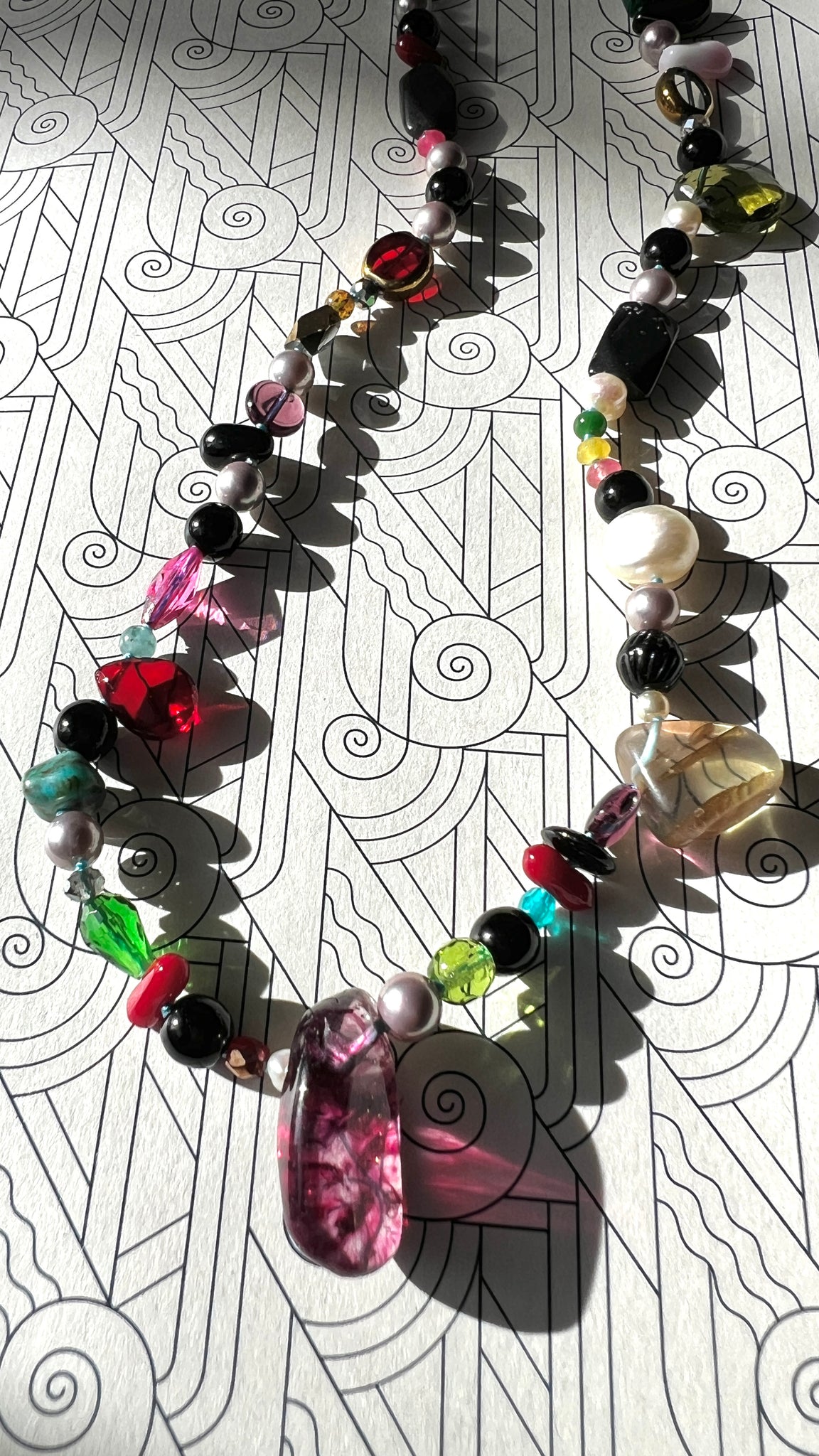 A unique necklace where vintage beads, freshwater pearls, agates, malachite and crystals come together in a harmonious blend of textures and tones. Designed to resonate with its wearer, this necklace isn't just an accessory, it's a piece that will find its person.