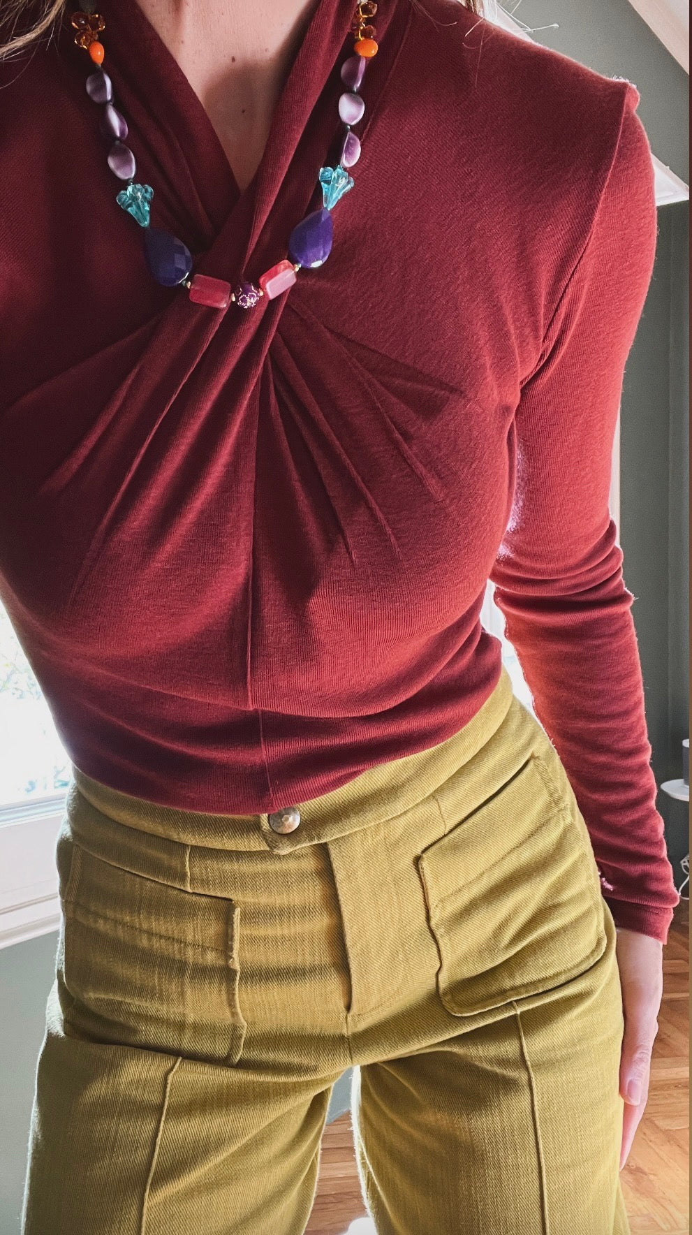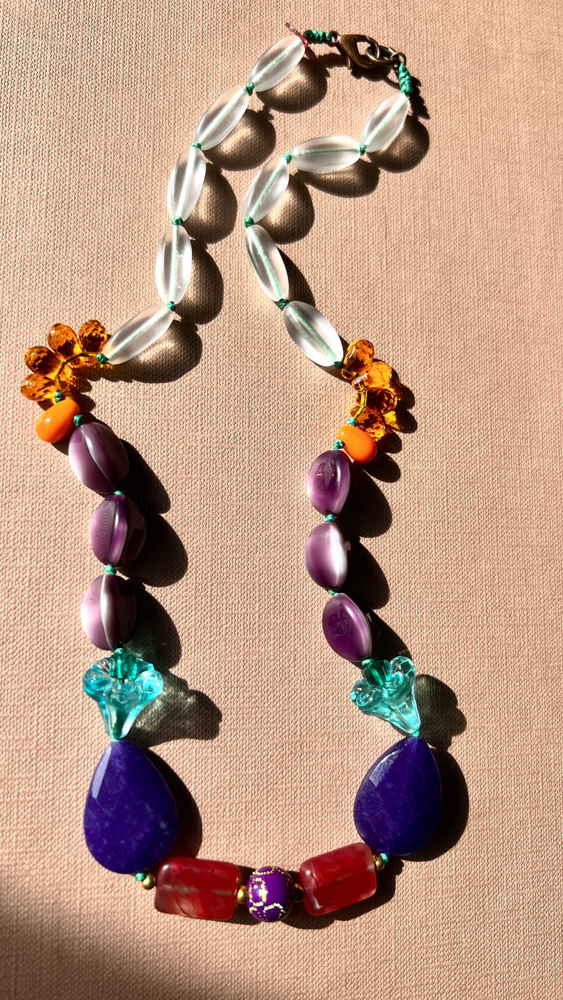 This one - of - a- kind necklace blends vintage beads with drop shaped purple agate stones, creating a play between soft translucence and vivid touches of colour.