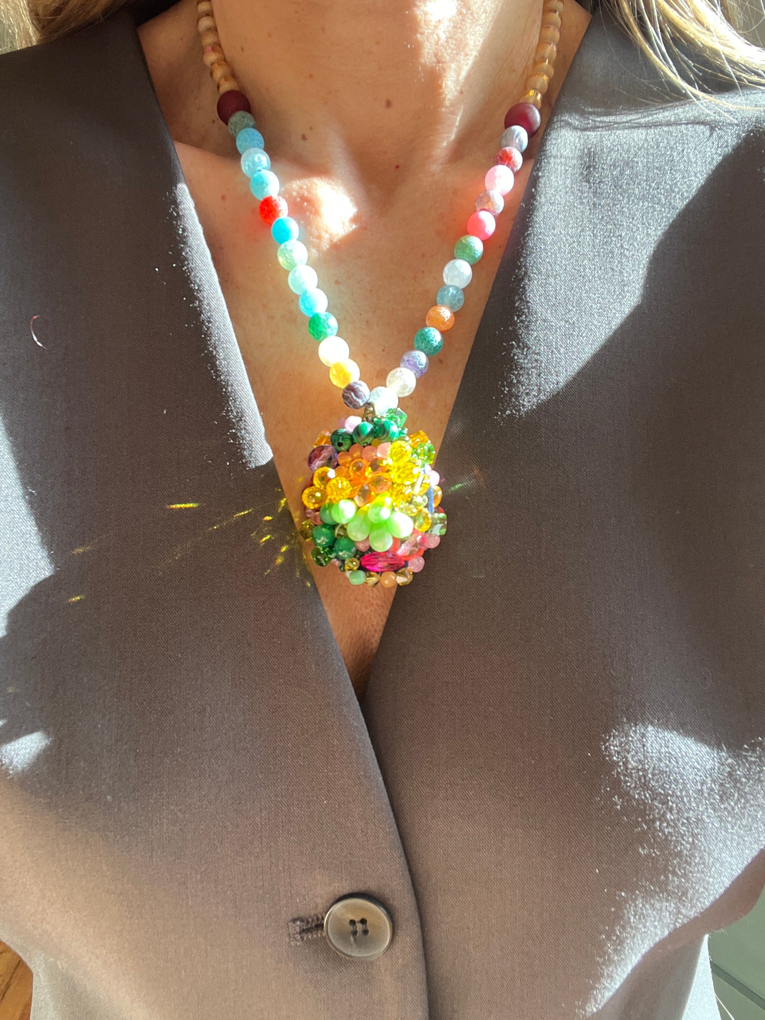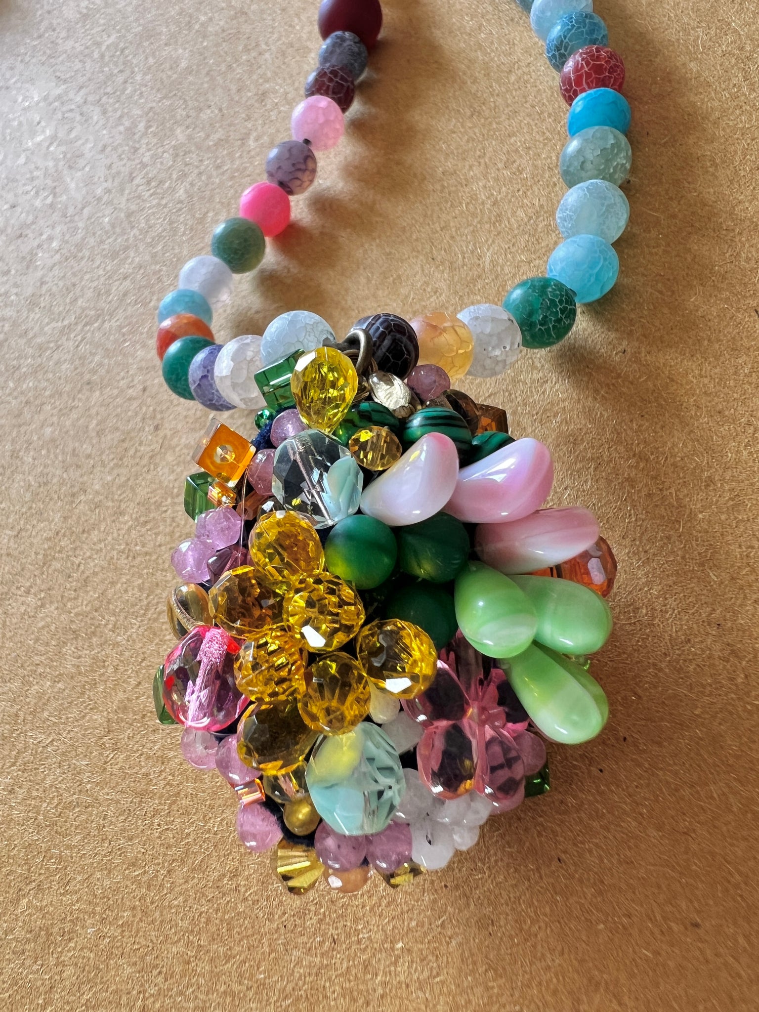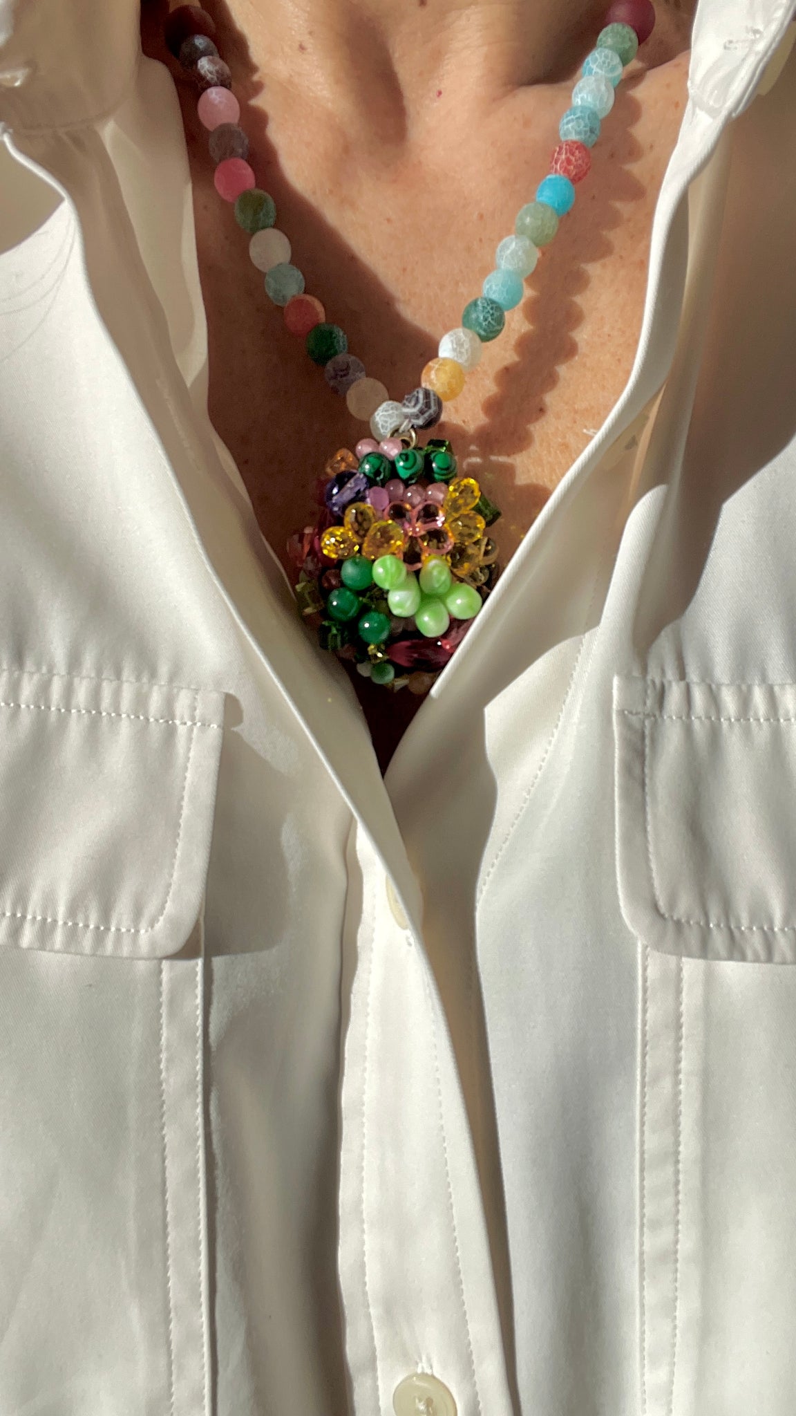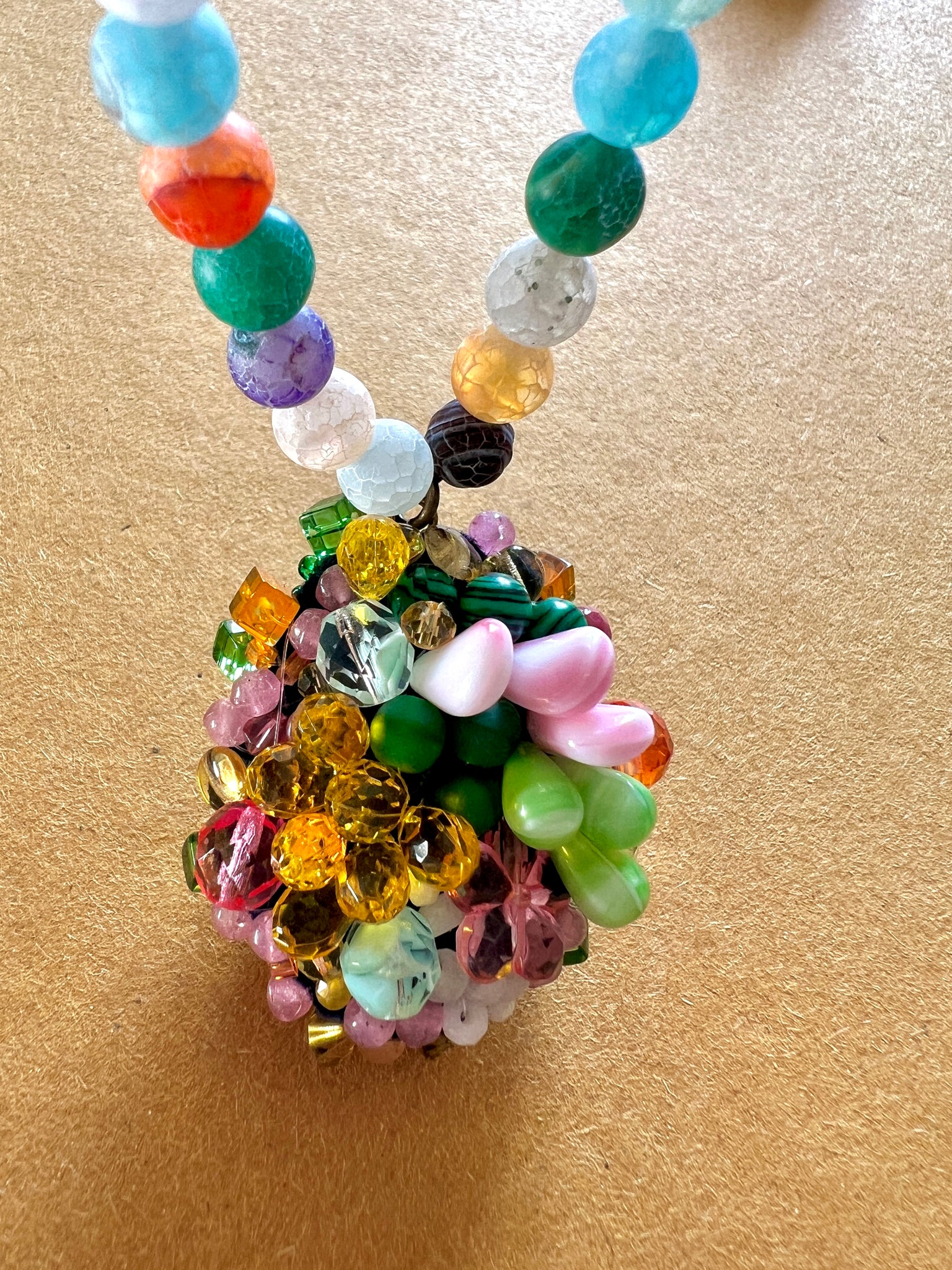 A delicate and romantic necklace inspired by the dreamy melancholy of the Virgin Suicides. Soft pink and pastel tones create a nostalgic feel. The hand-sewn pendant features vintage beads, crystals and natural malachite, while the necklace is finished with matte multi-coloured agates and glass beads, for a gentle organic touch.